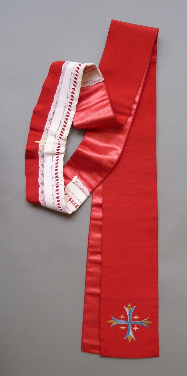 Rode stola met blauw-grijze leliekruisjes met goudleer