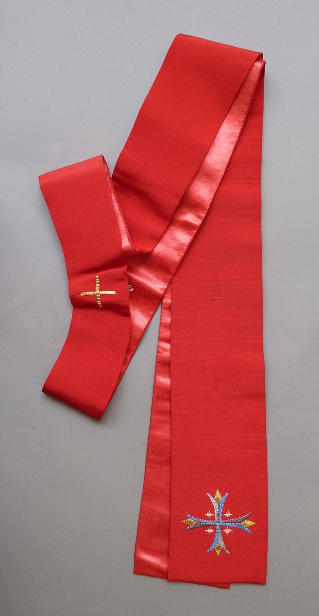 Rode stola met blauw-grijze leliekruisjes met goudleer