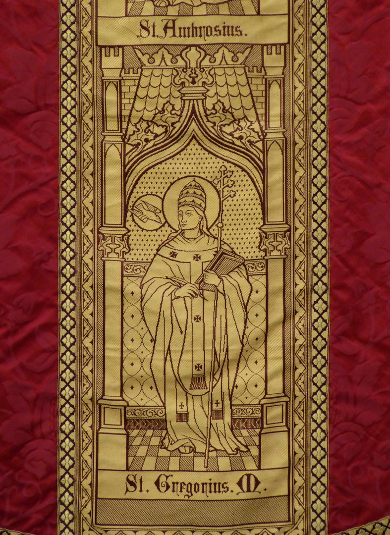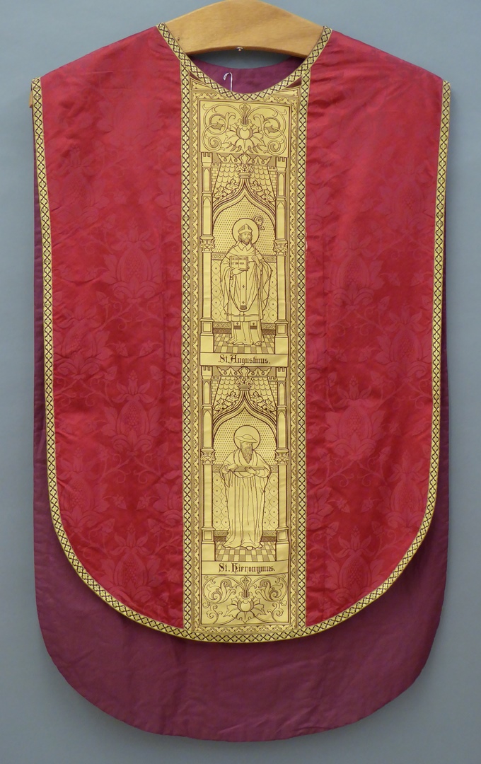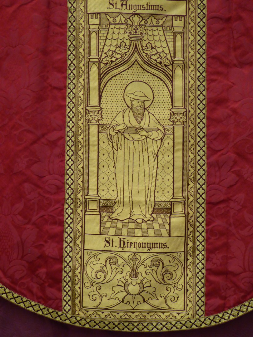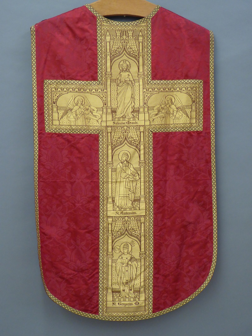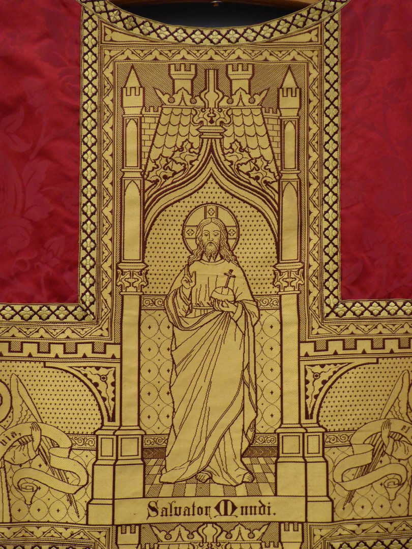 Rood kazuifel met ingeweven granaatappelmotief, met kerkvaders, heiligen en Salvator mundi