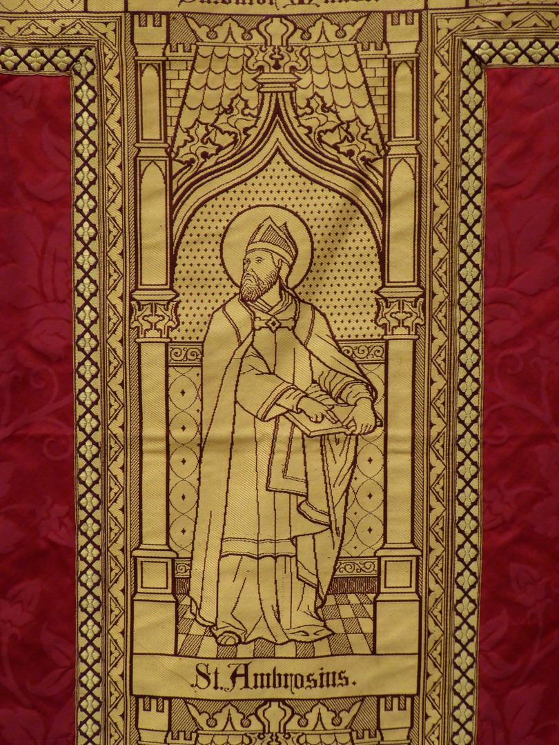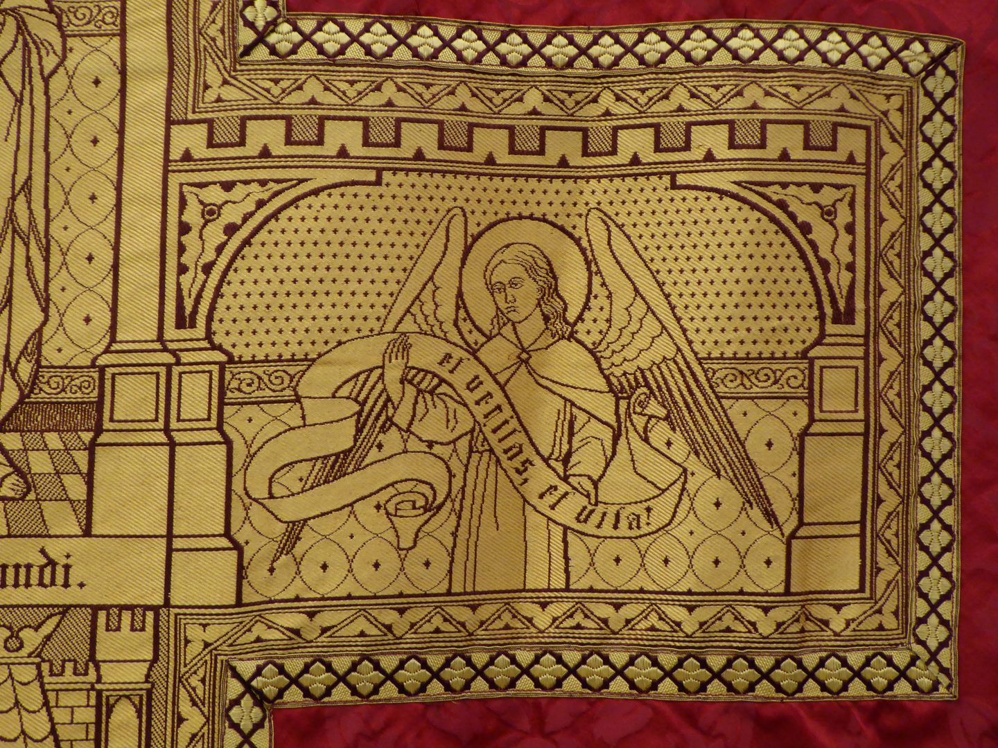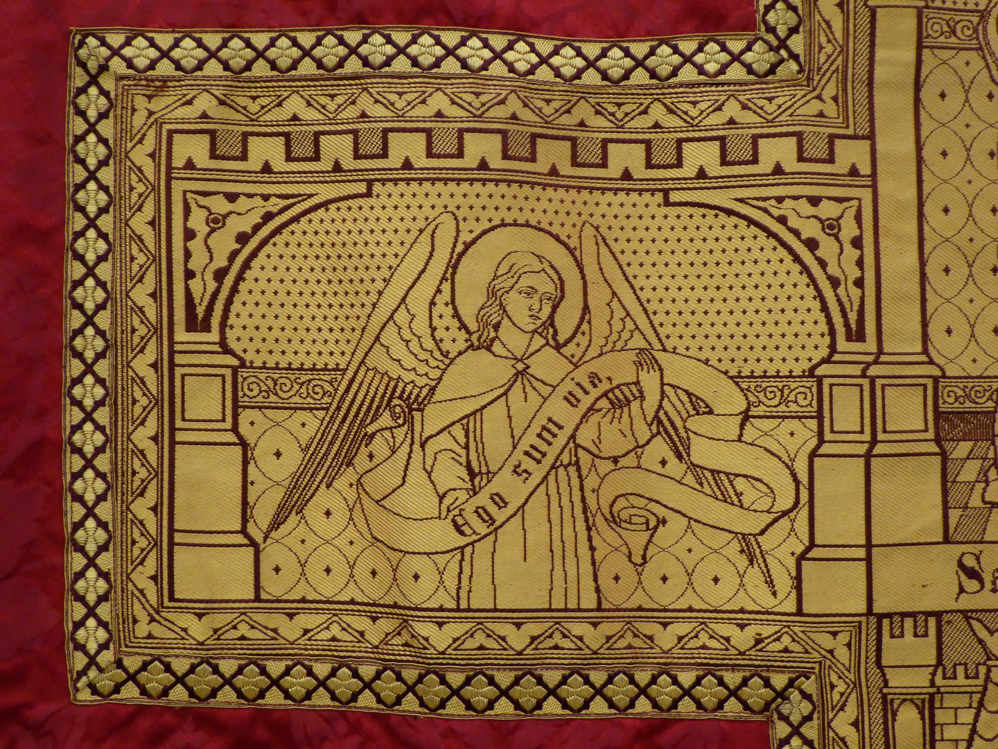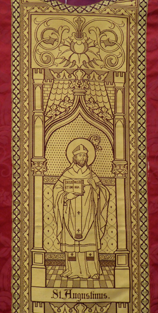 Rood kazuifel met ingeweven granaatappelmotief, met kerkvaders, heiligen en Salvator mundi