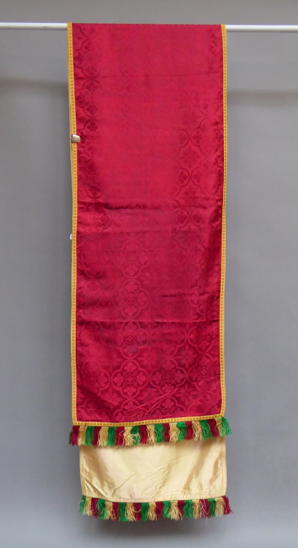 Rood schoudervelum met ingeweven vierpassen met druivenranken, rood-geel galonband, kleurige franje