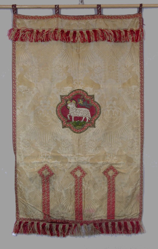Wit sacramentsvaan met Lam Gods en ingeweven gele herten en adelaars