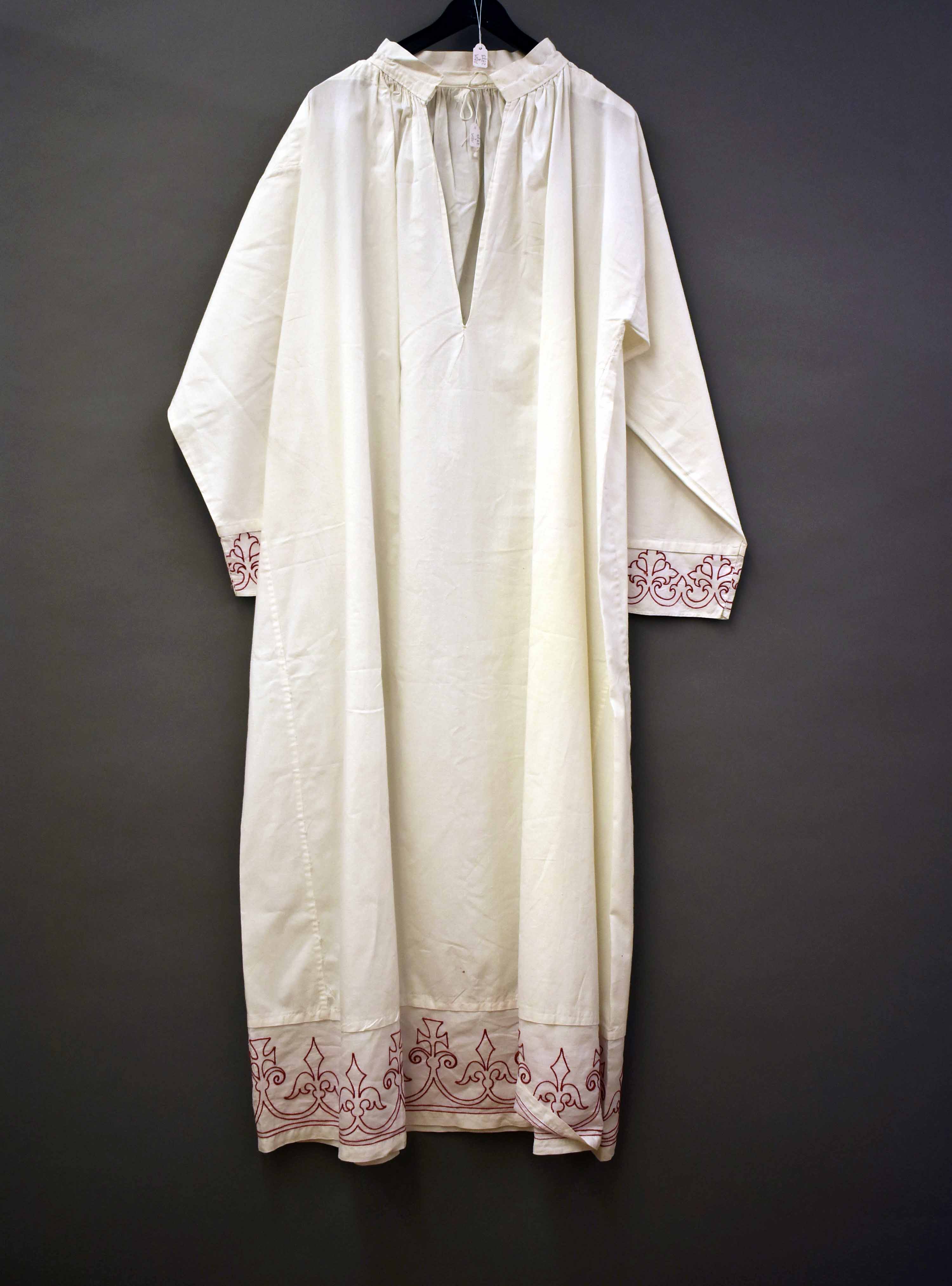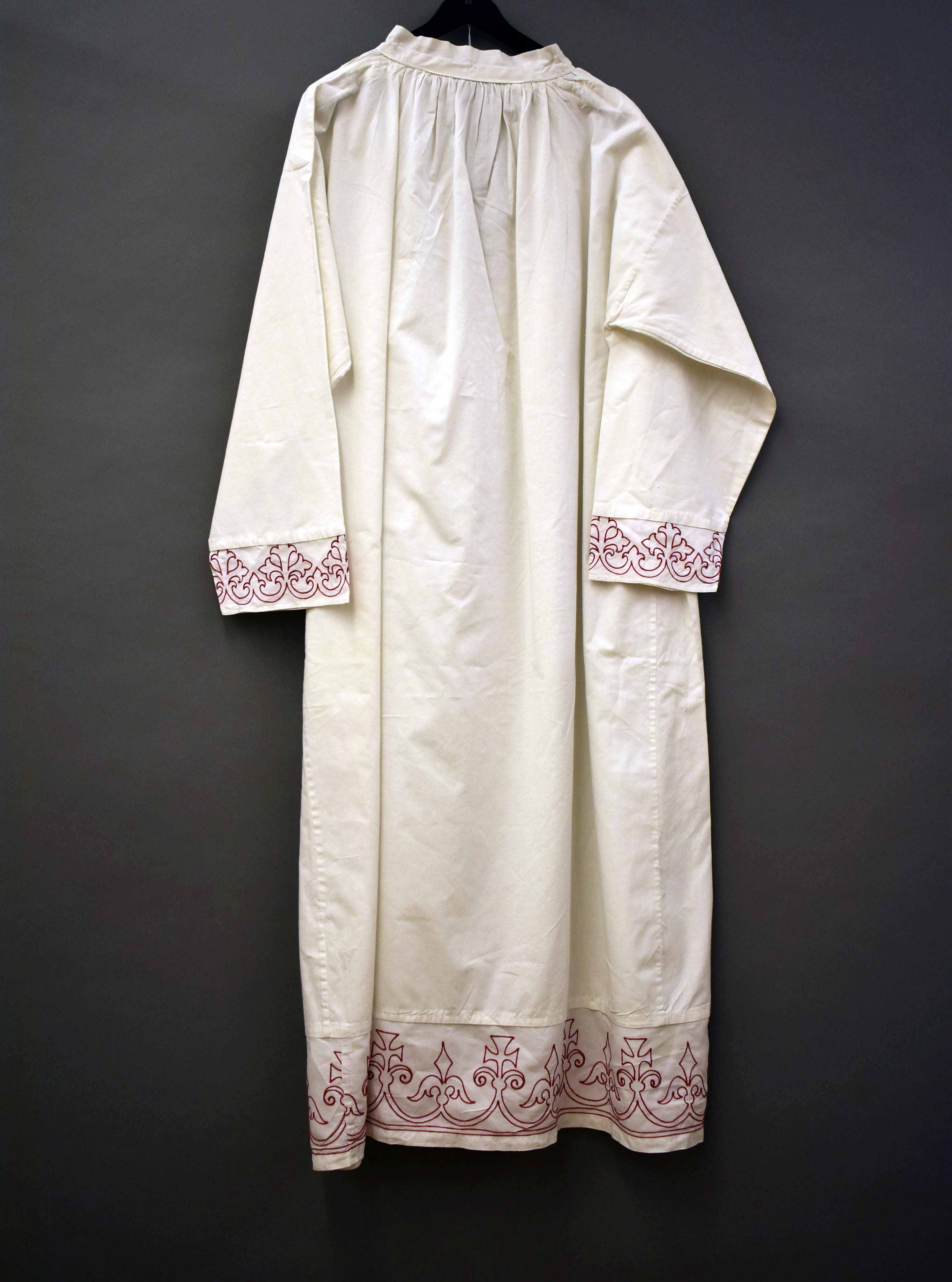 Kinderalbe met strook machinaal borduurwerk in rood