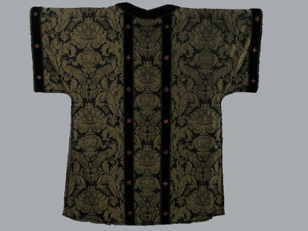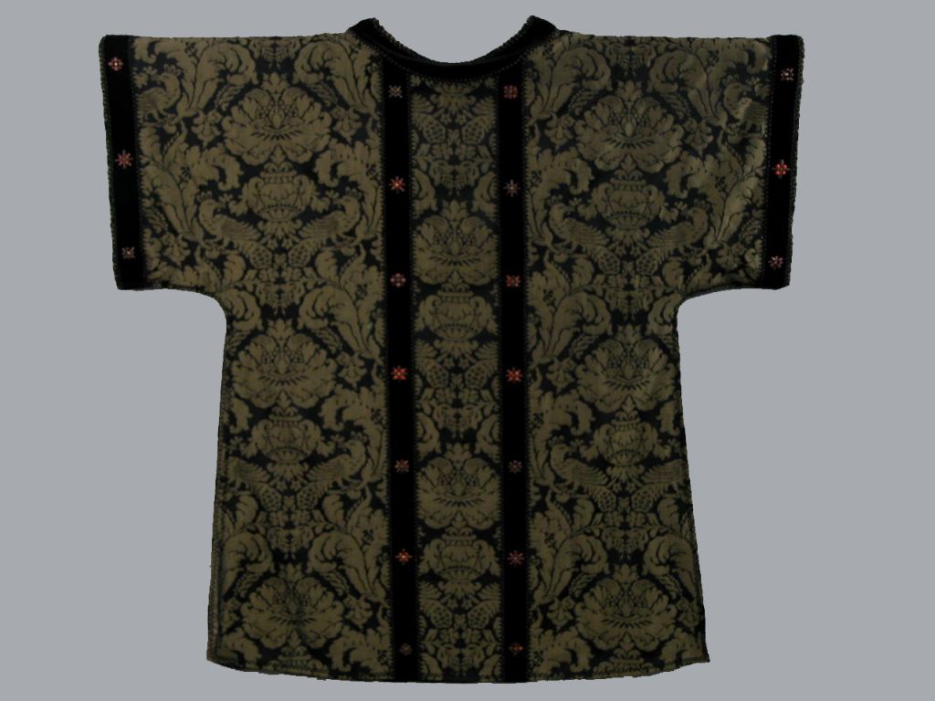 Zwarte dalmatiek met ingeweven goudkleurige vogels en ranken