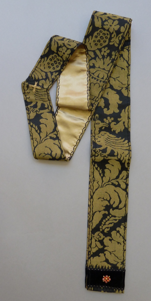 Zwarte diakenstola met ingeweven goudkleurige vogels en ranken met zwart fluwelen uiteinden