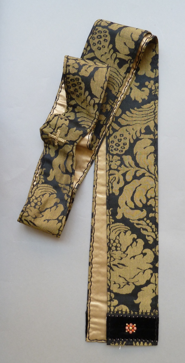 Zwarte stola met ingeweven goudkleurige vogels en ranken met zwart fluwelen uiteinden