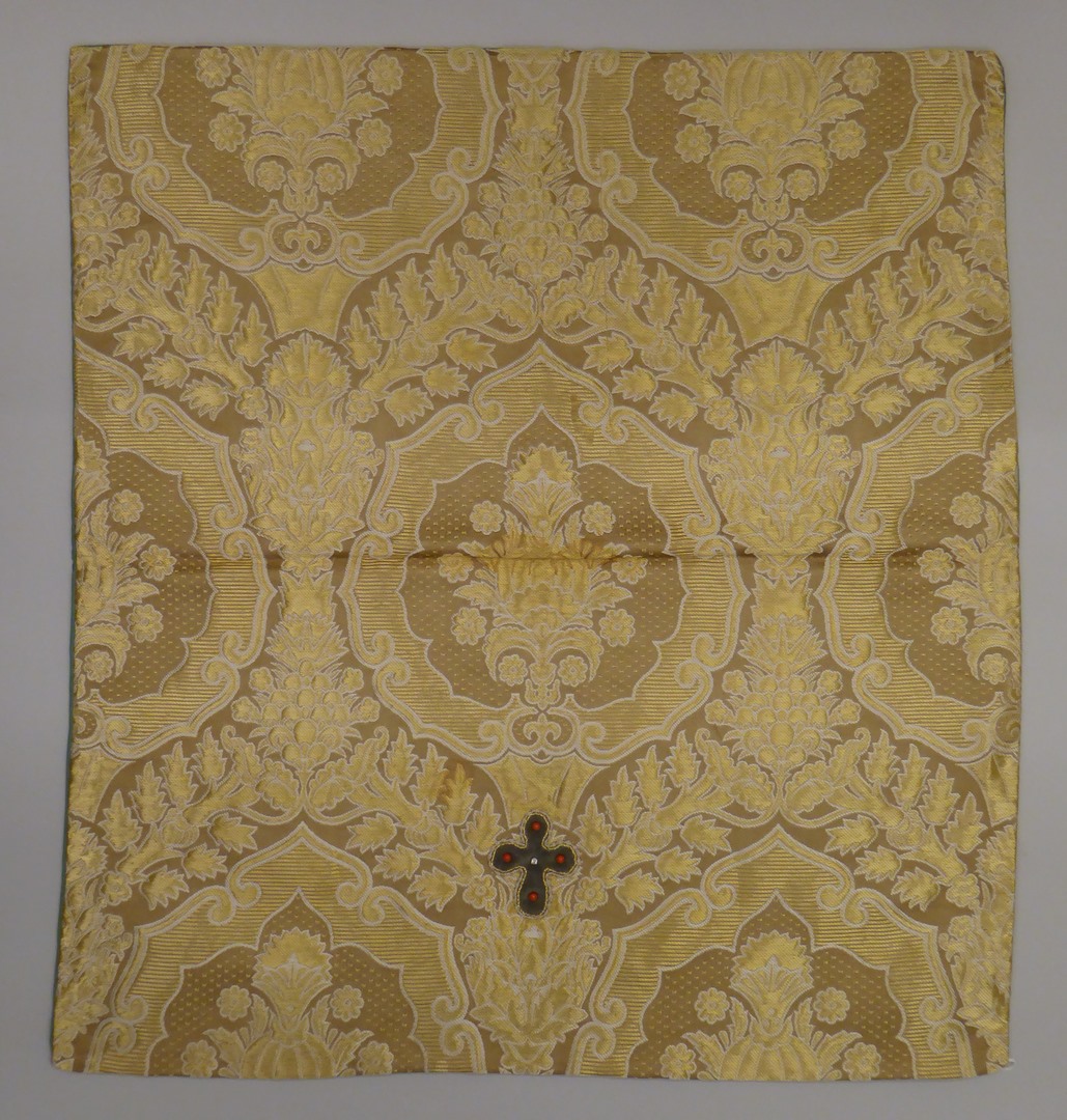 Goudkleurig velum met ingeweven granaatappels en grijs kruisje