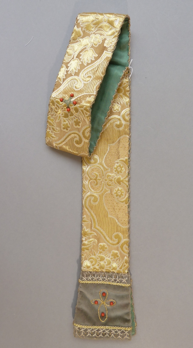 Goudkleurige manipel met ingeweven granaatappelpatroon en grijze uiteinden