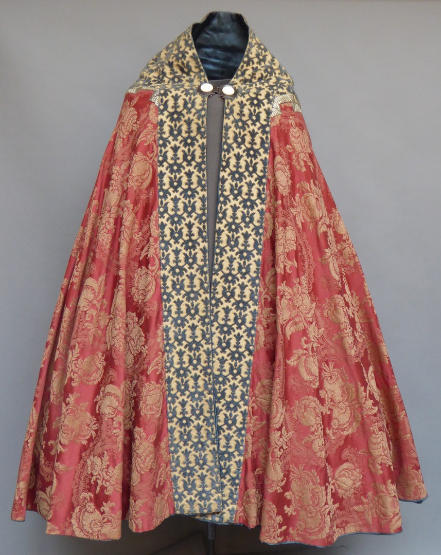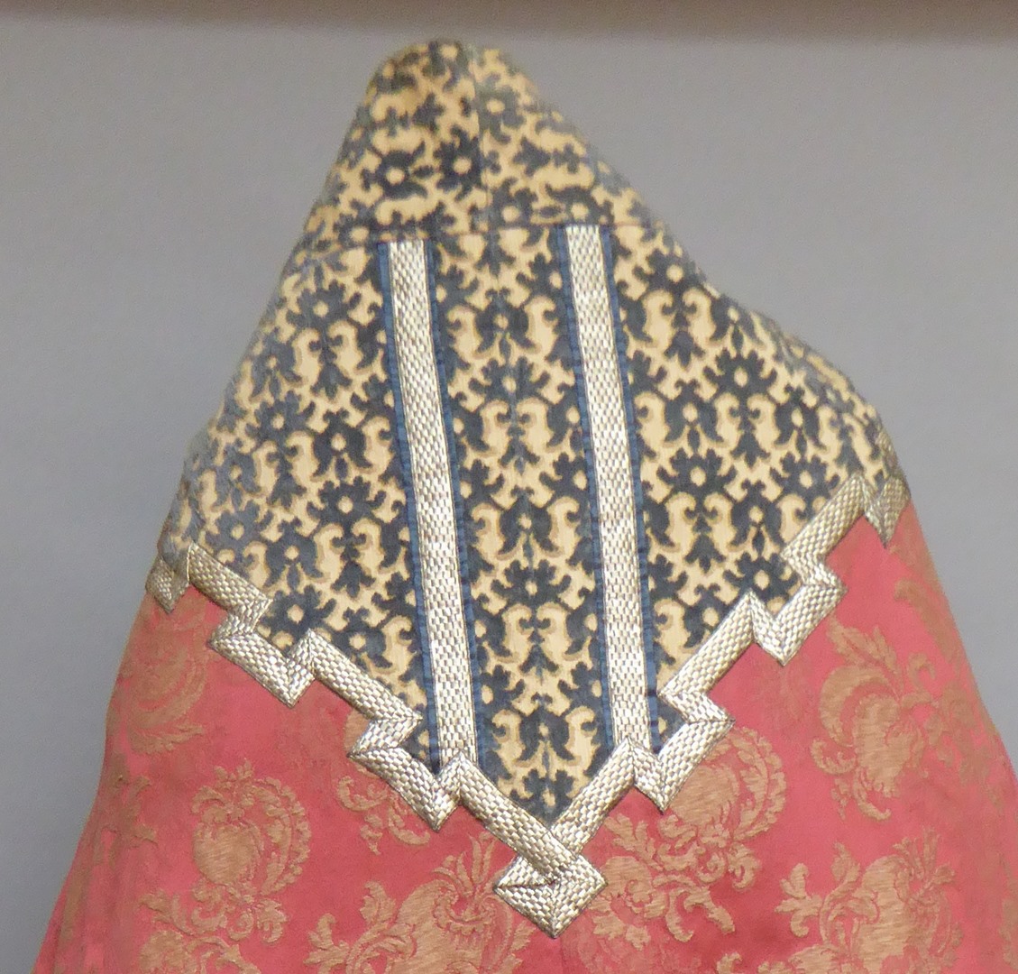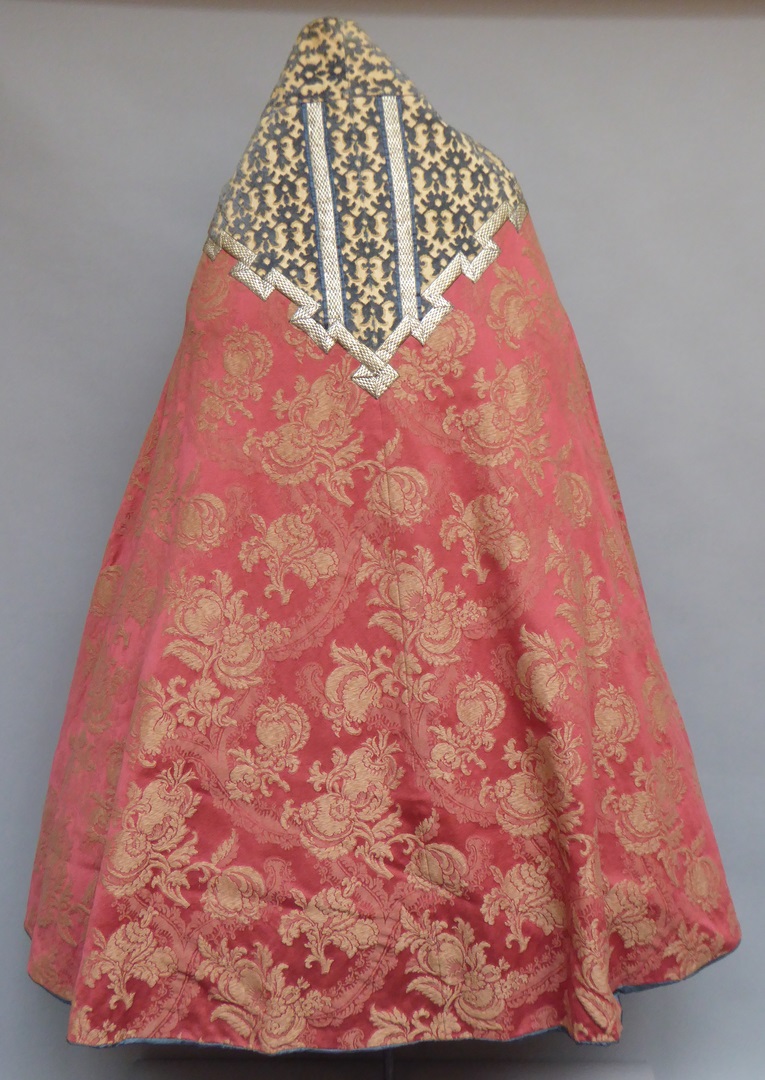 Rode koorkap voor celebrant met ingeweven witte granaatappels en banen met blauwe ranken