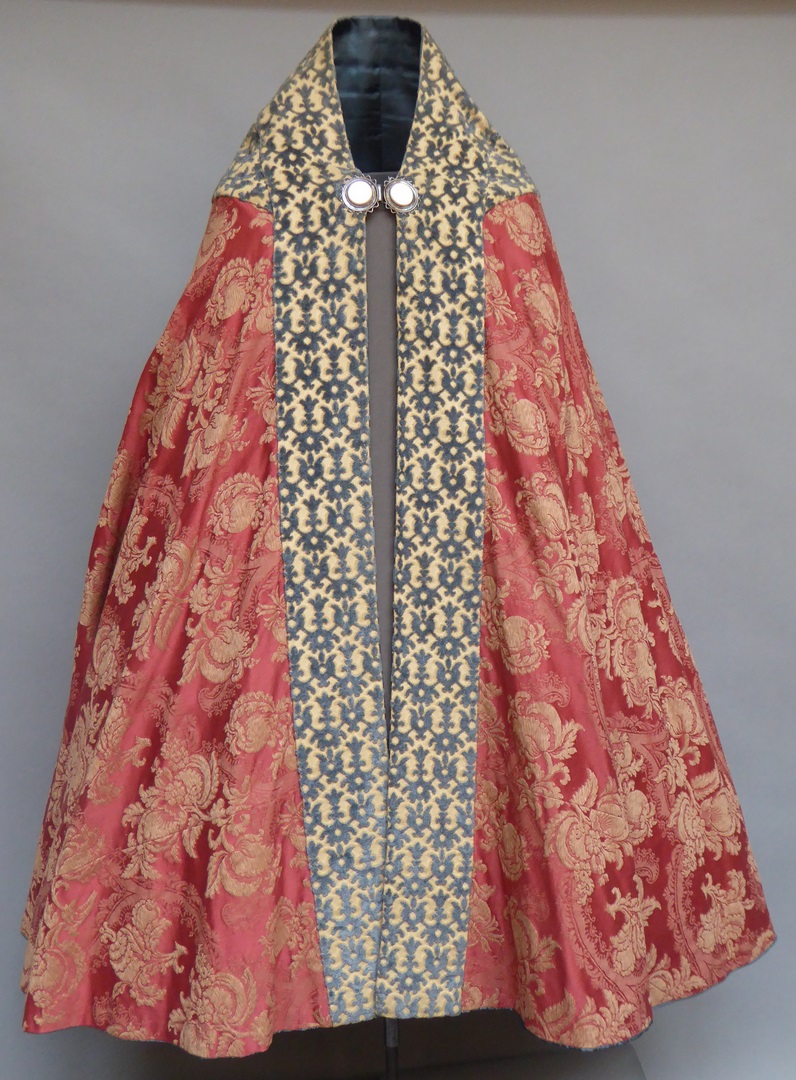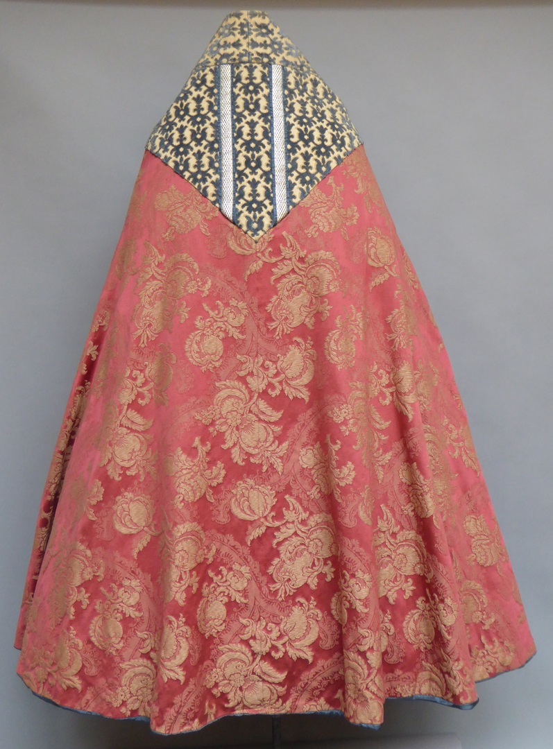 Rode koorkap voor diaken met ingeweven witte granaatappels en banen met blauwe ranken