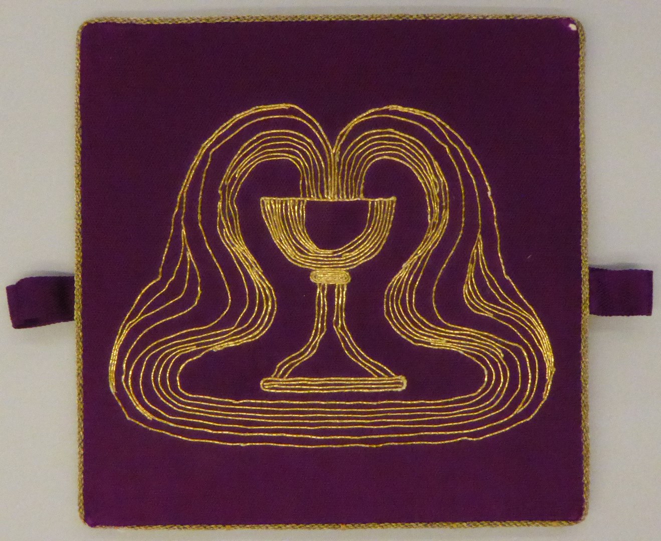 Paarse beurs met overvloeiende kelk in gouddraad geborduurd