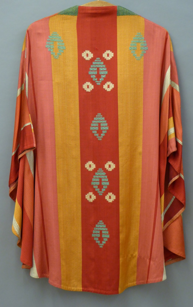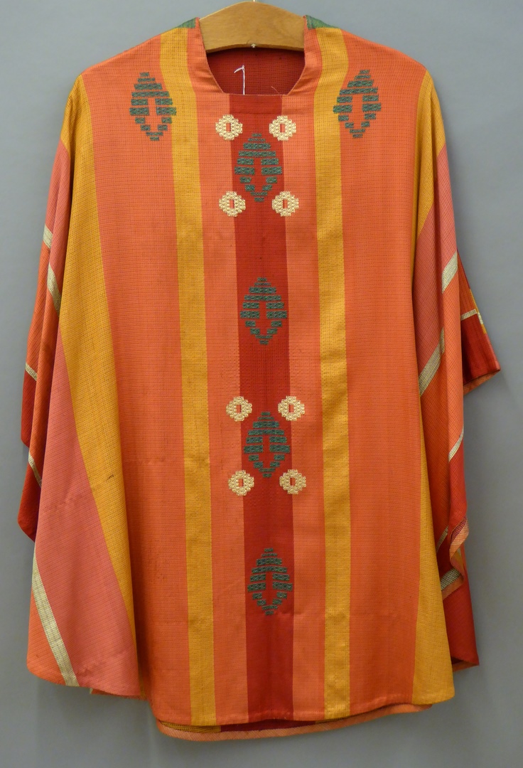 Rood, roze en geel gestreept kazuifel met borduurwerk, doorweven met zilverdraad