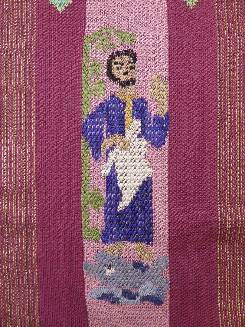 Paars gordijn met goud doorweven, geborduurd met vis en bijbelse figuur met schriftrol