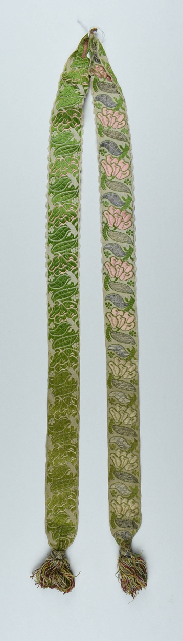 Twee witte missaallinten met ingeweven roze bloemmotieven en bladwerk in zilver en groen