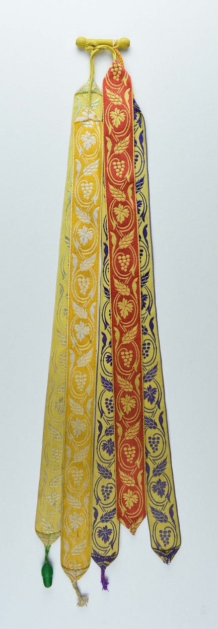 Vijf missaallinten in liturgische kleuren met ingeweven eikenblad en druiventros, aan stokje