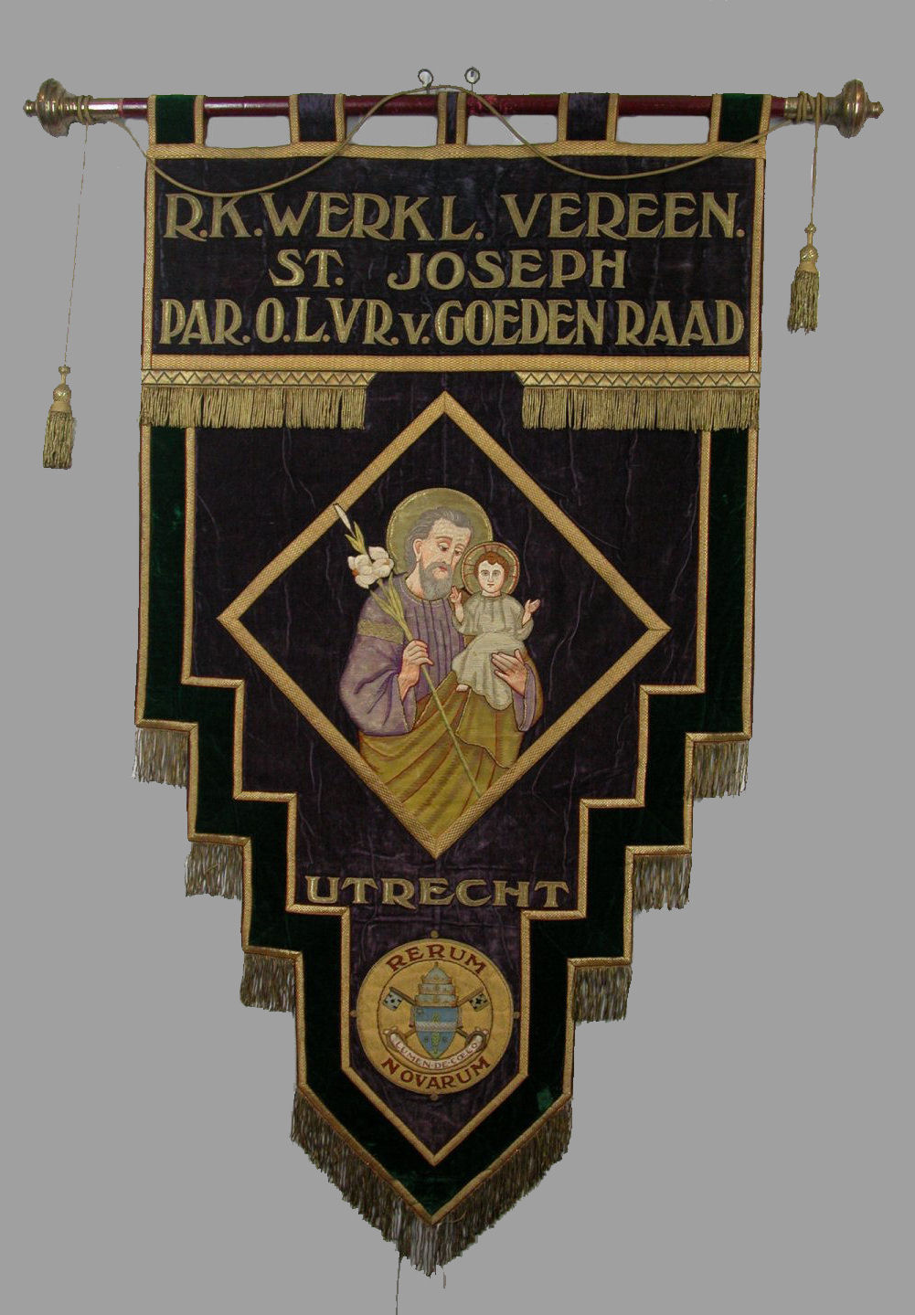 Paars vaandel van de werkliedenvereniging St. Joseph met "Rerum Novarum" en "Lumen de Coelo"