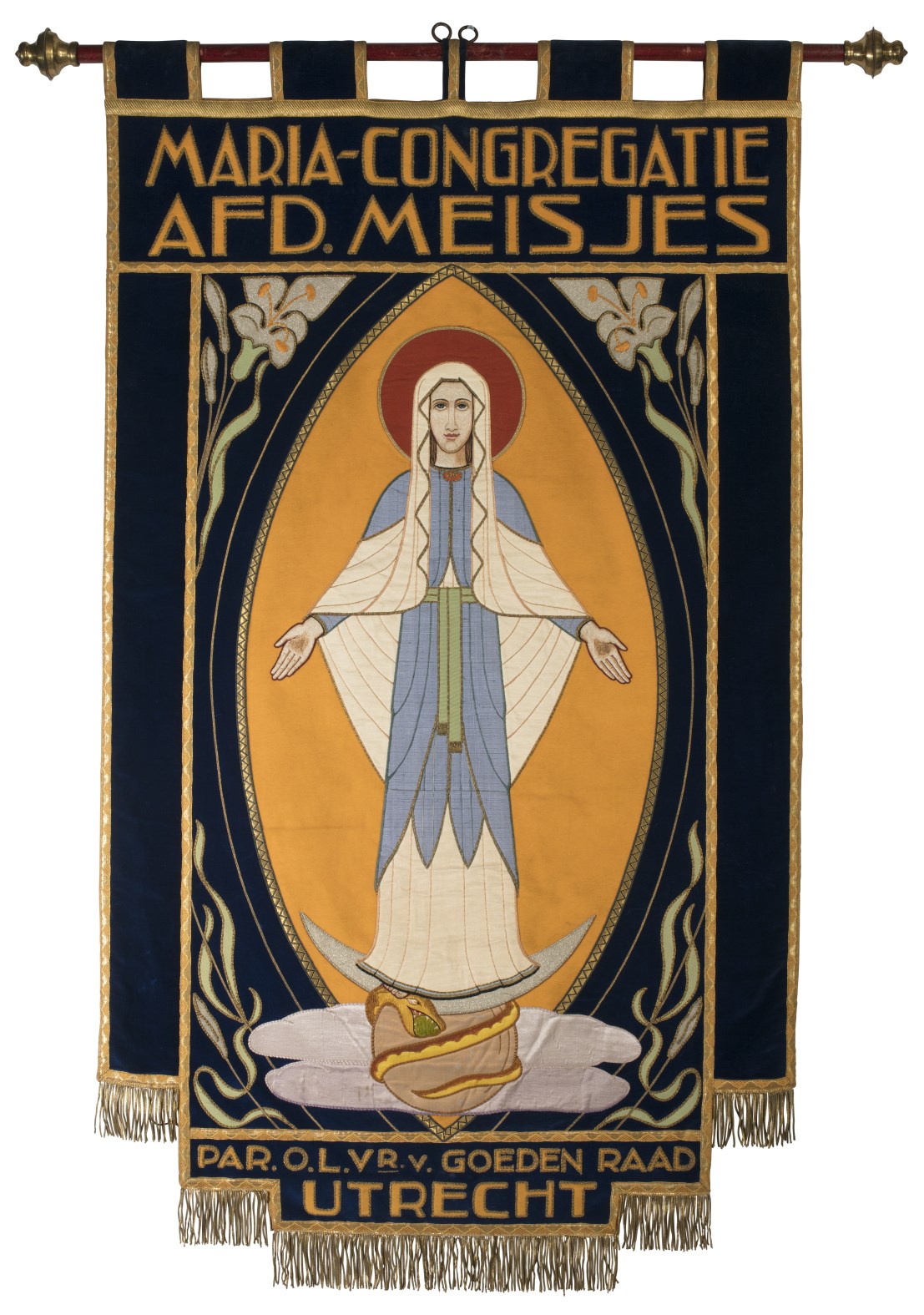 Blauw vaandel met Onbevlekte Ontvangenis van Maria, van Maria-Congregatie afdeling Meisjes van de parochie O.L.V. van Goede Raad, Nieuw Engeland, Utrecht