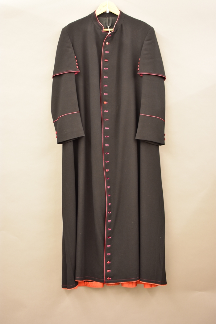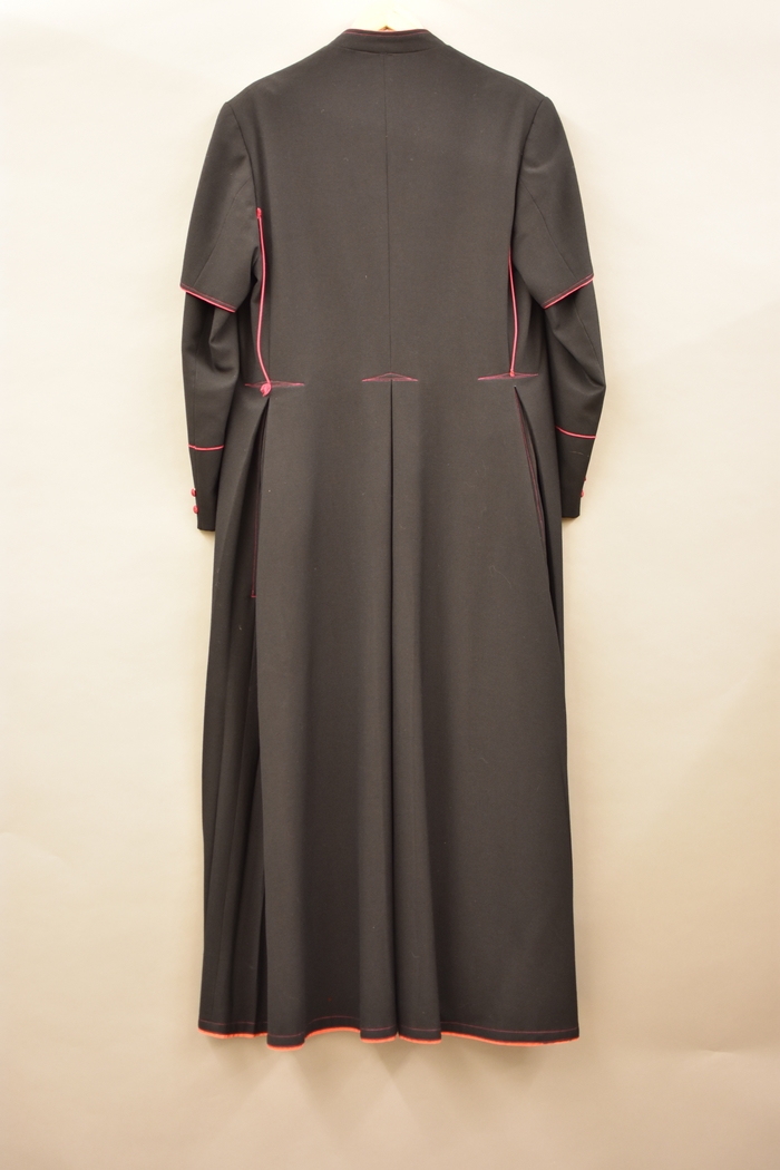 Zwarte toog met paarse, rode(?) knoopjes en boordsels, rode onderrand, 'klein rood'(?)
