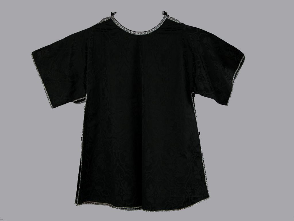 Zwarte onderdalmatiek met ingeweven granaatappelpatroon, afgezet met zwart-wit galon