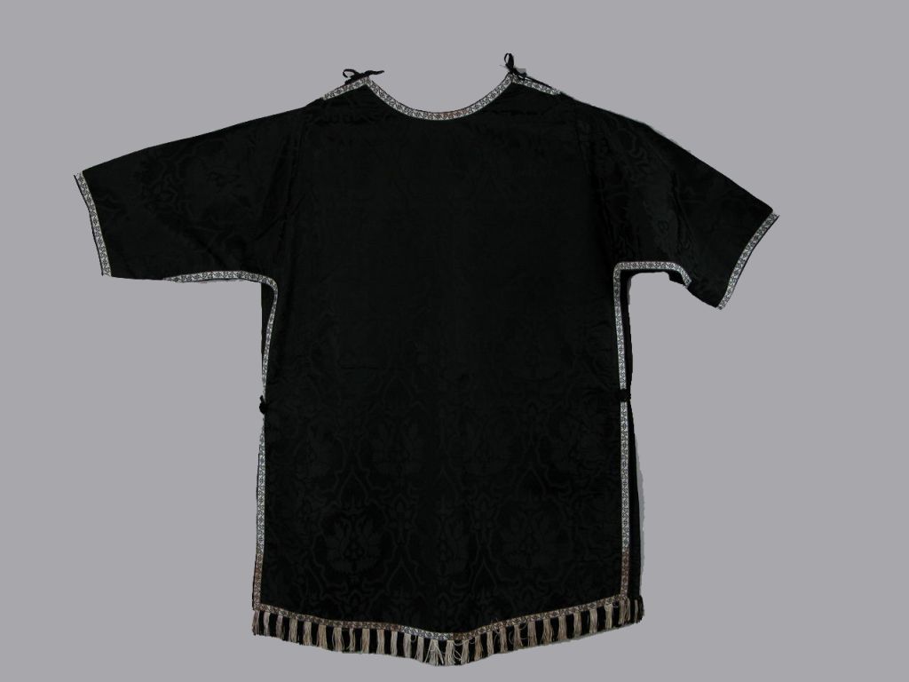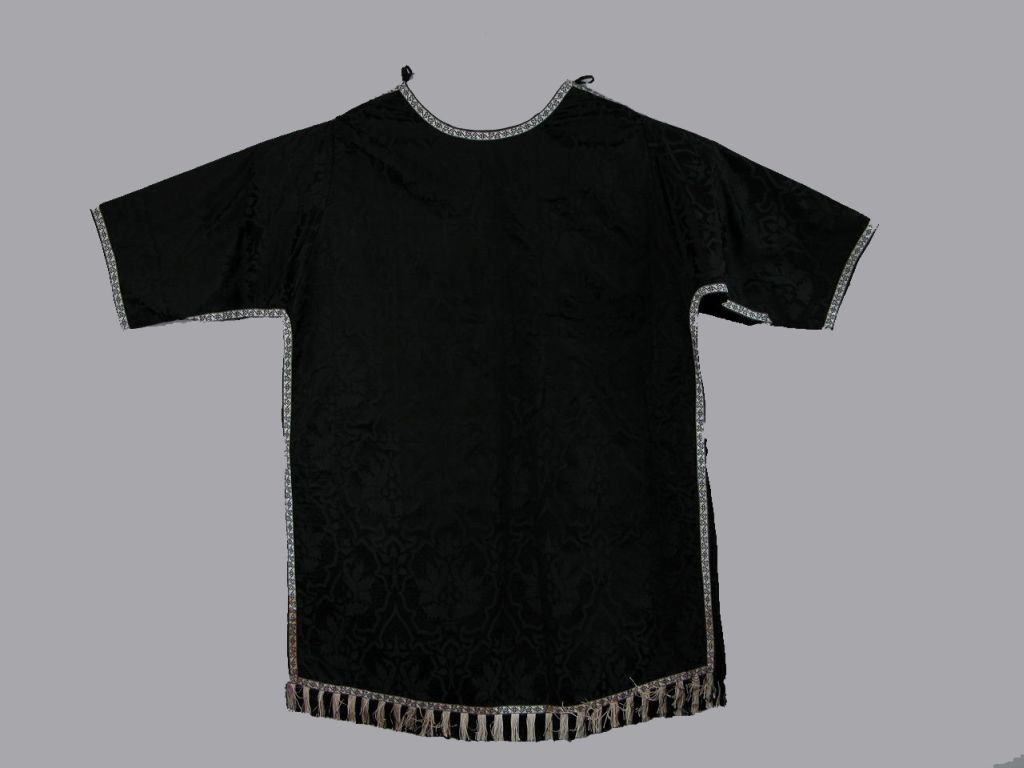 Zwarte ondertuniek met ingeweven granaatappelpatroon, afgezet met zwart-wit galon