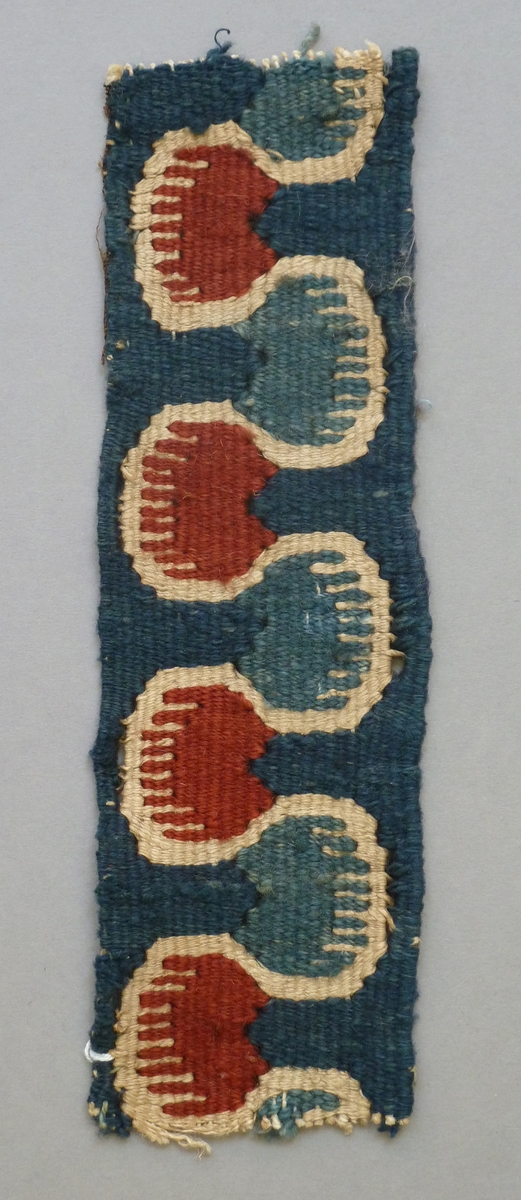 Blauwe geweven band met geschulpt motief in blauw, rood en wit