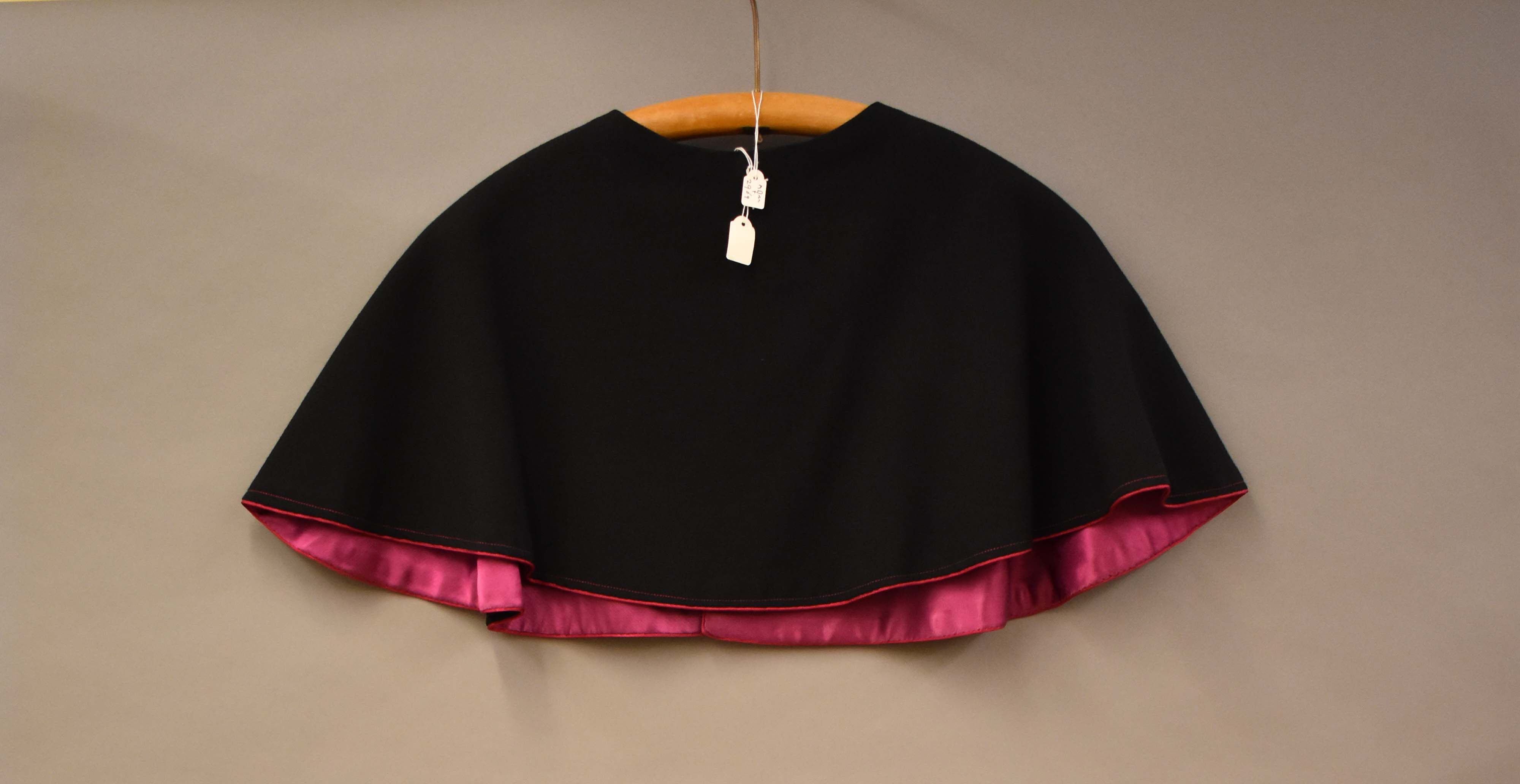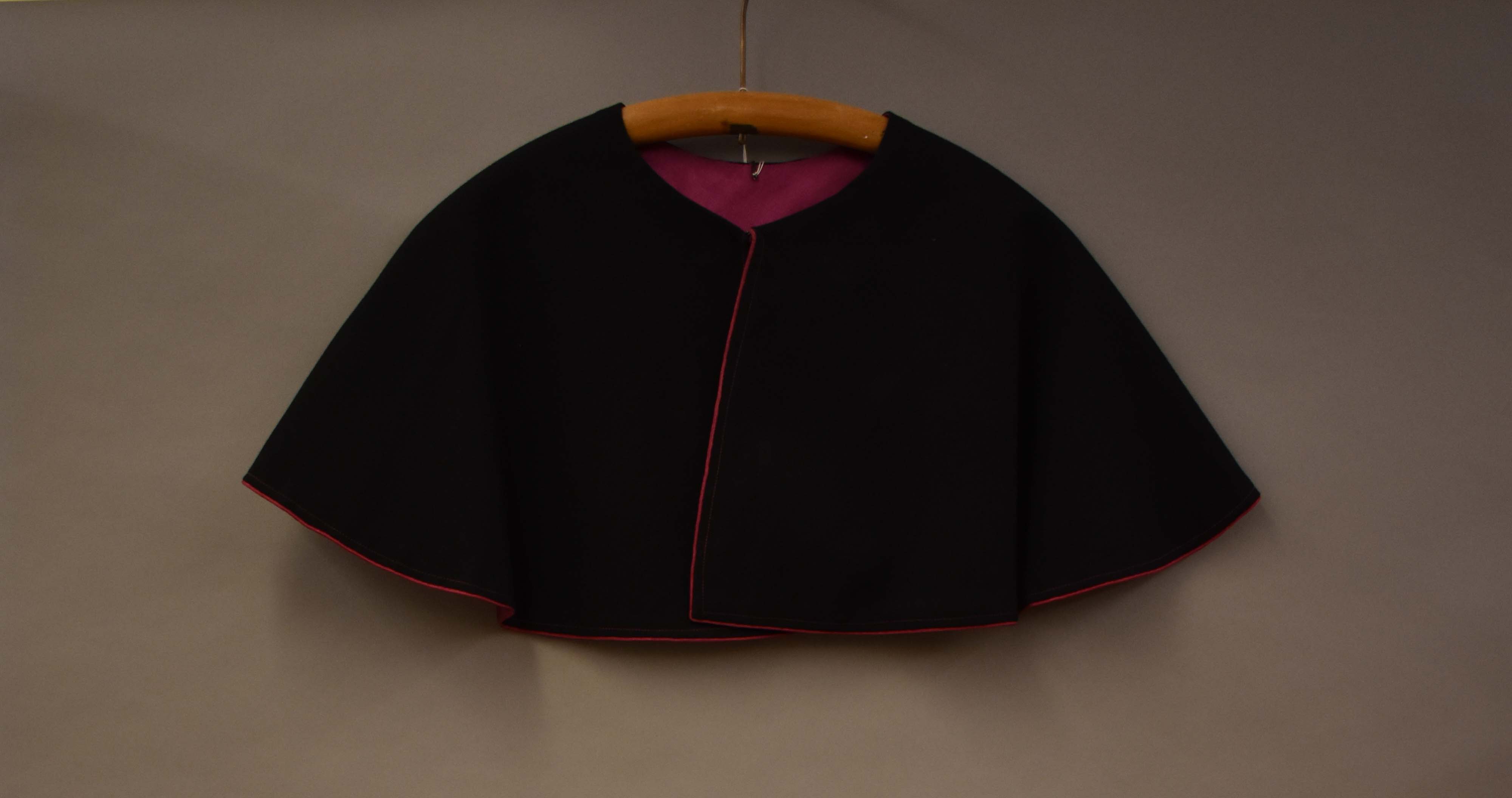 Zwarte schoudermantel met paarse voering en rand, onderdeel 'klein paars'