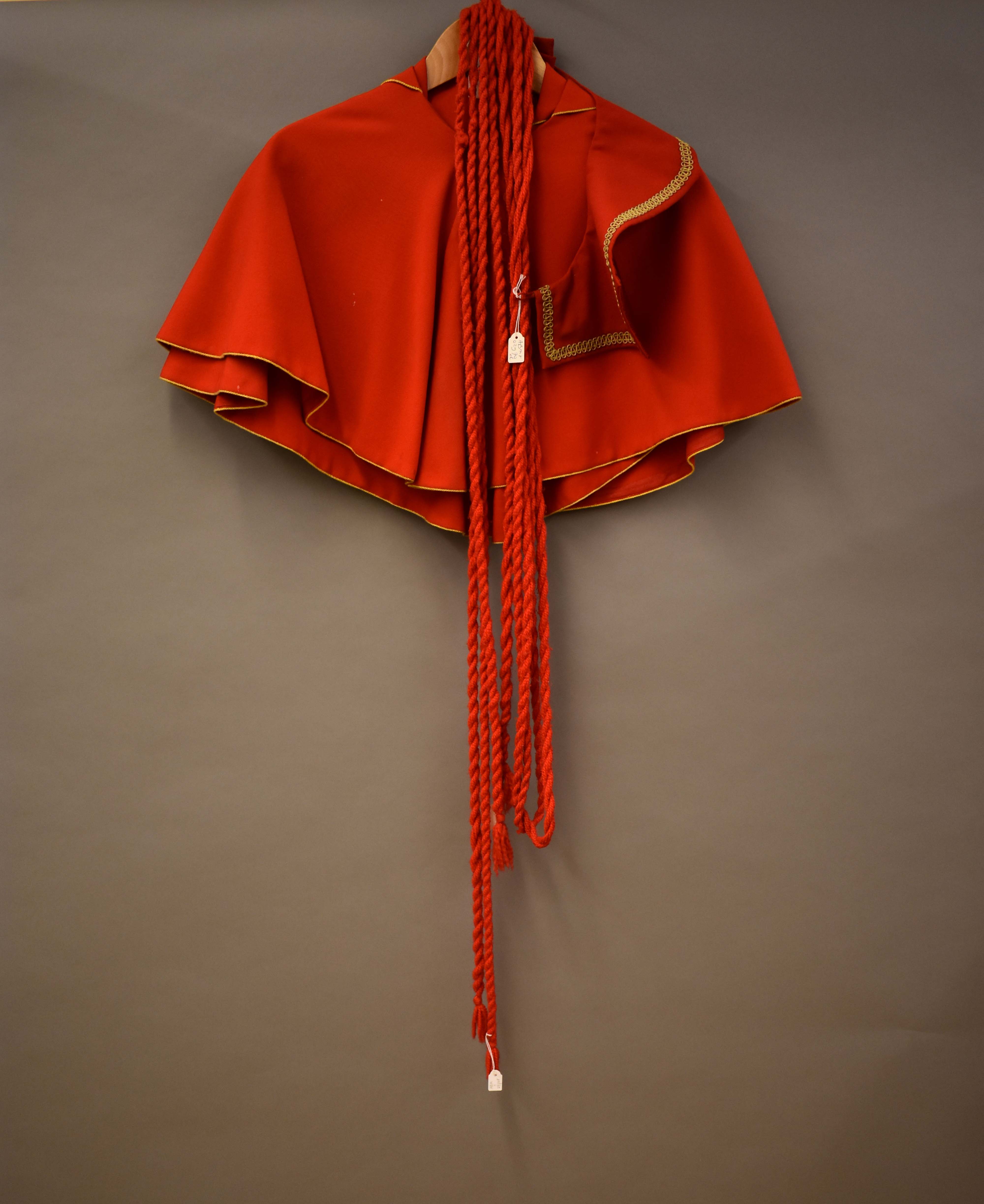 Rode schoudermantel met puntkraag met kwast, afgebiesd met geel