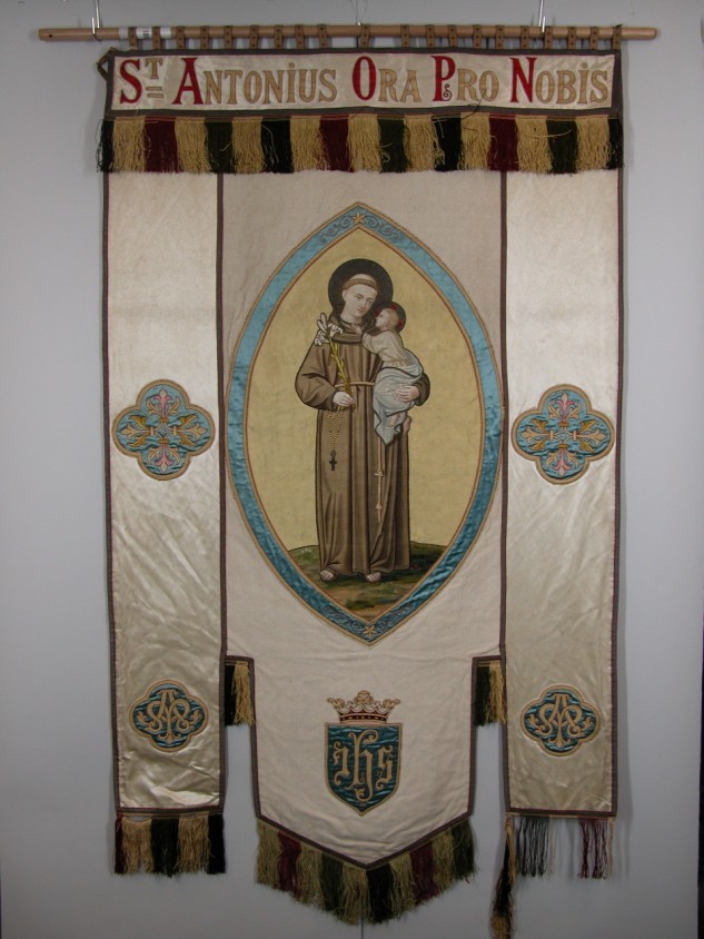 Wit vaandel met "St. Antonius Ora Pro Nobis", Antonius in mandorla en wapenschild met IHS