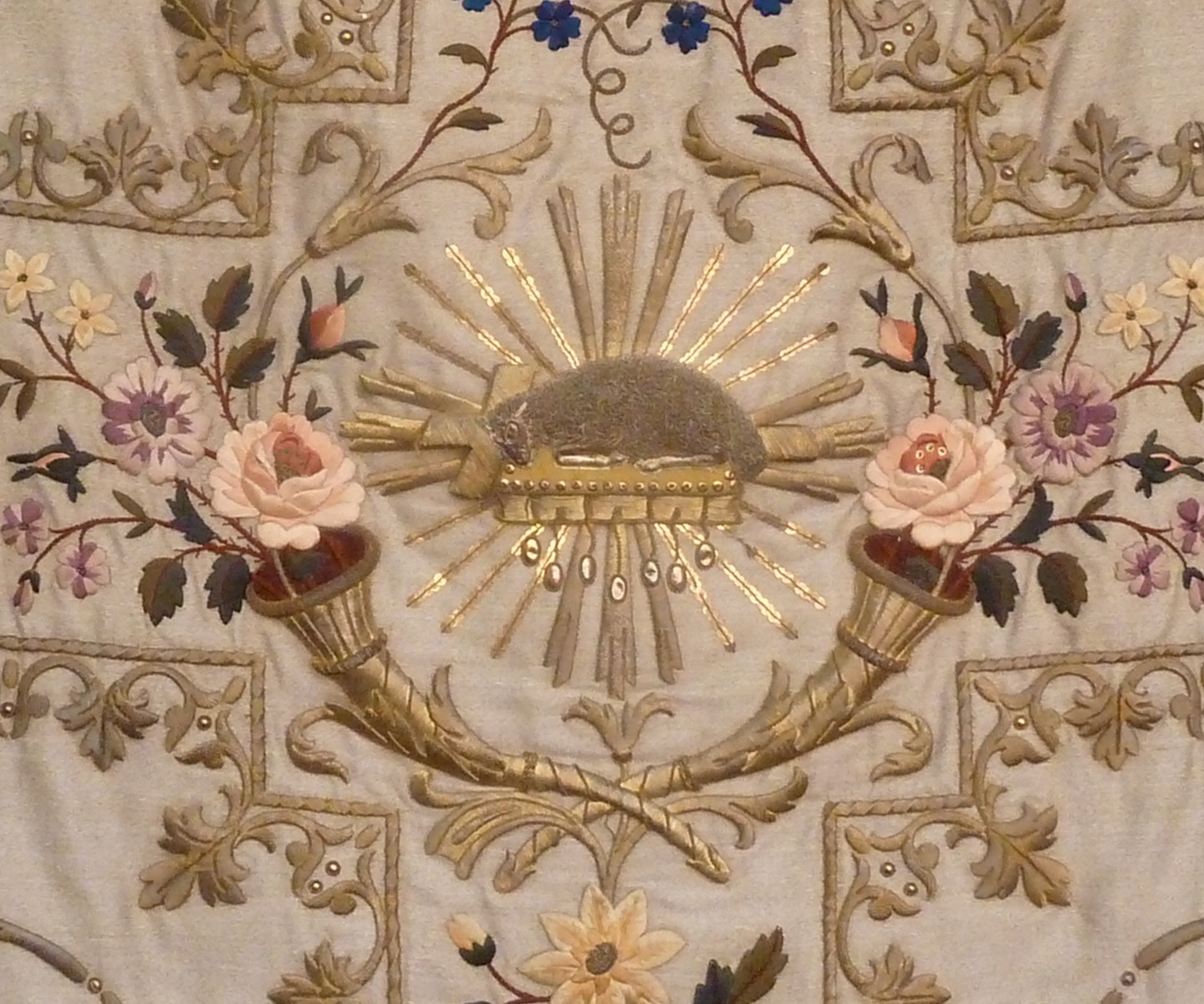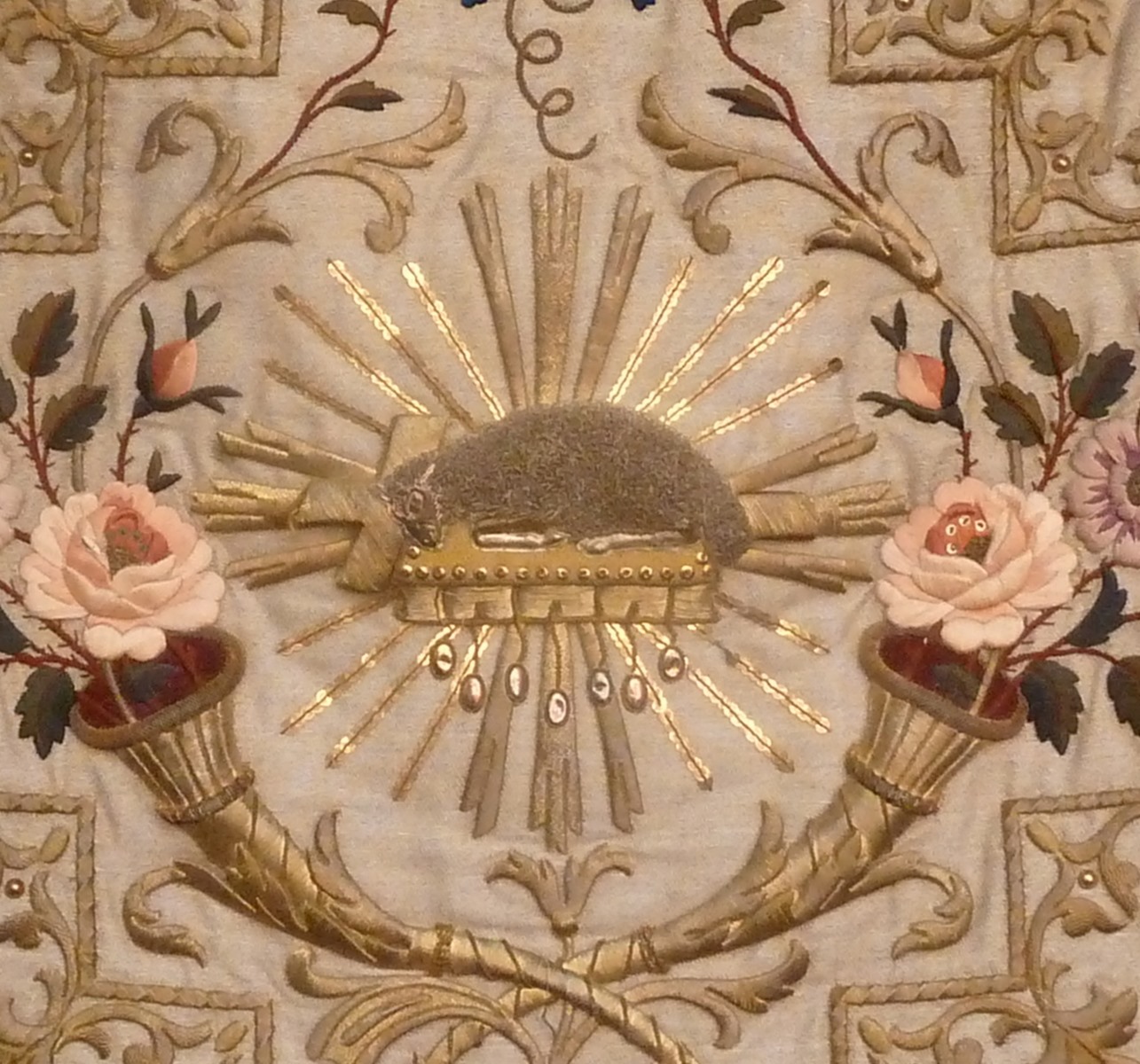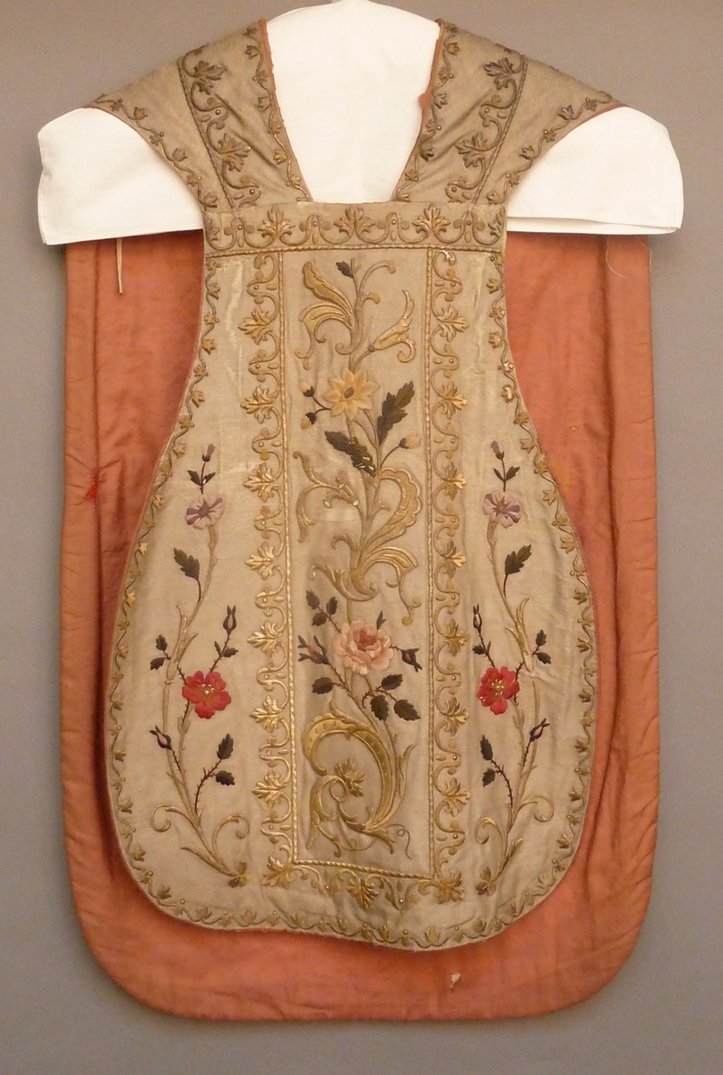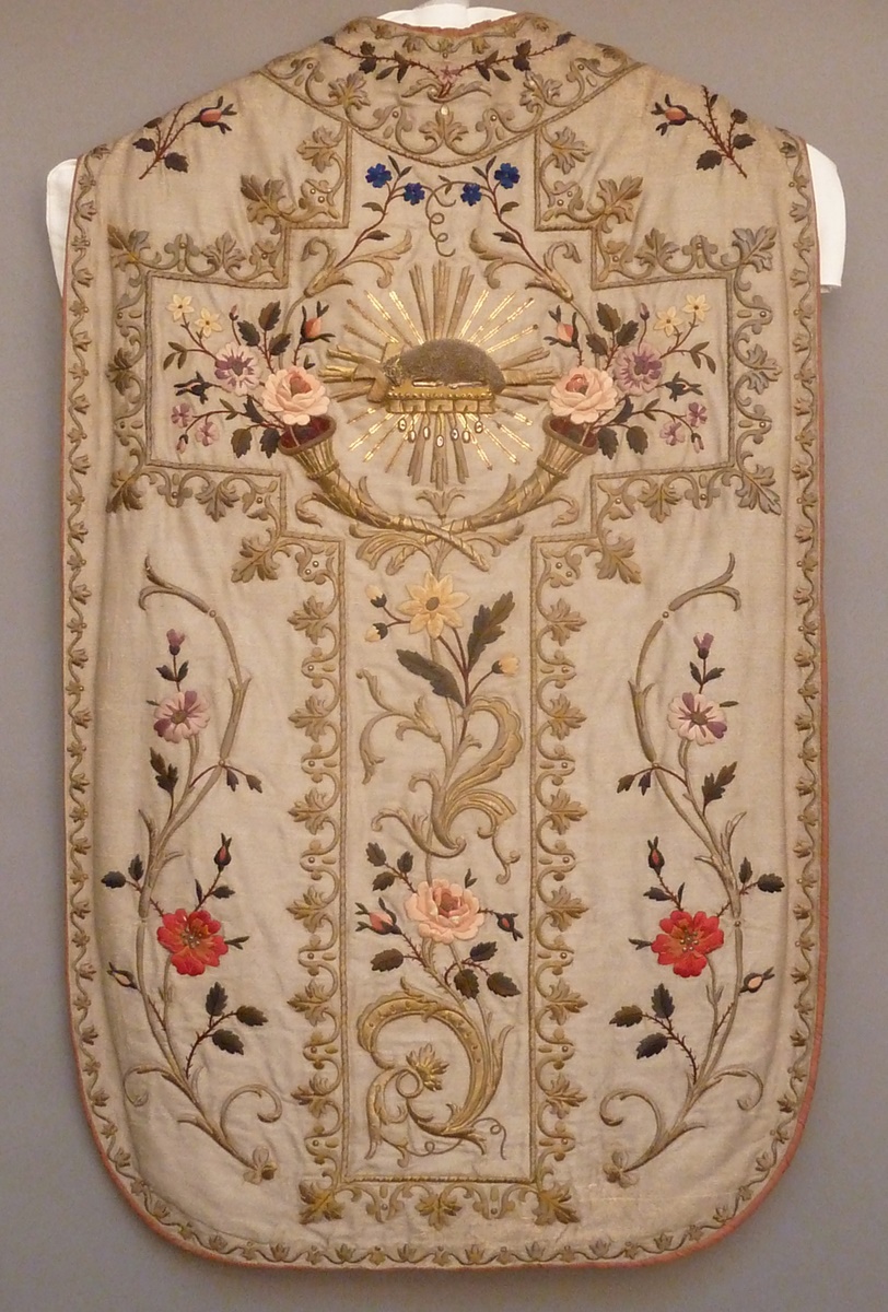 Wit kazuifel met Lam Gods op boek met zeven zegels en florale motieven
