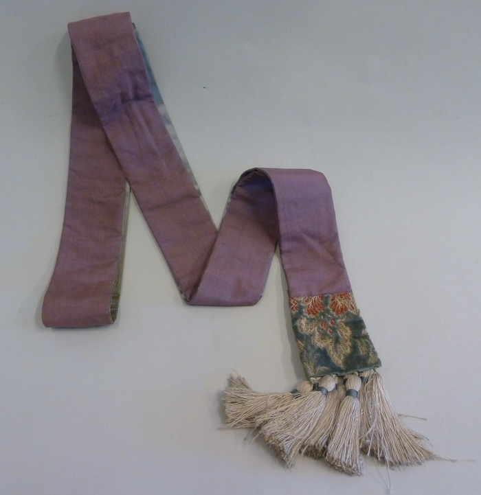 Paarse stola van shantungzijde met geborduurd kruis en blauwgroen fluwelen uiteinden met vier kwasten