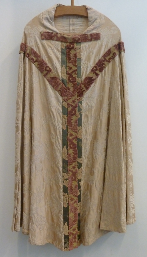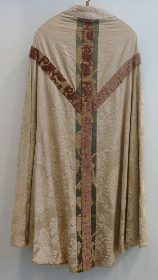 Wit kazuifel van zijdedamast met ingeweven florale motieven, met paars op groen gaffelkruis
