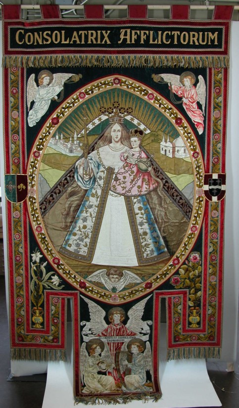Rood vaandel met "Consolatrix afflictorum" met O.L.V. van Kevelaer, Luxemburgse kerkgebouwen en engelen, wapens van stad Kevelaer en aartsbisschop Van de Wetering