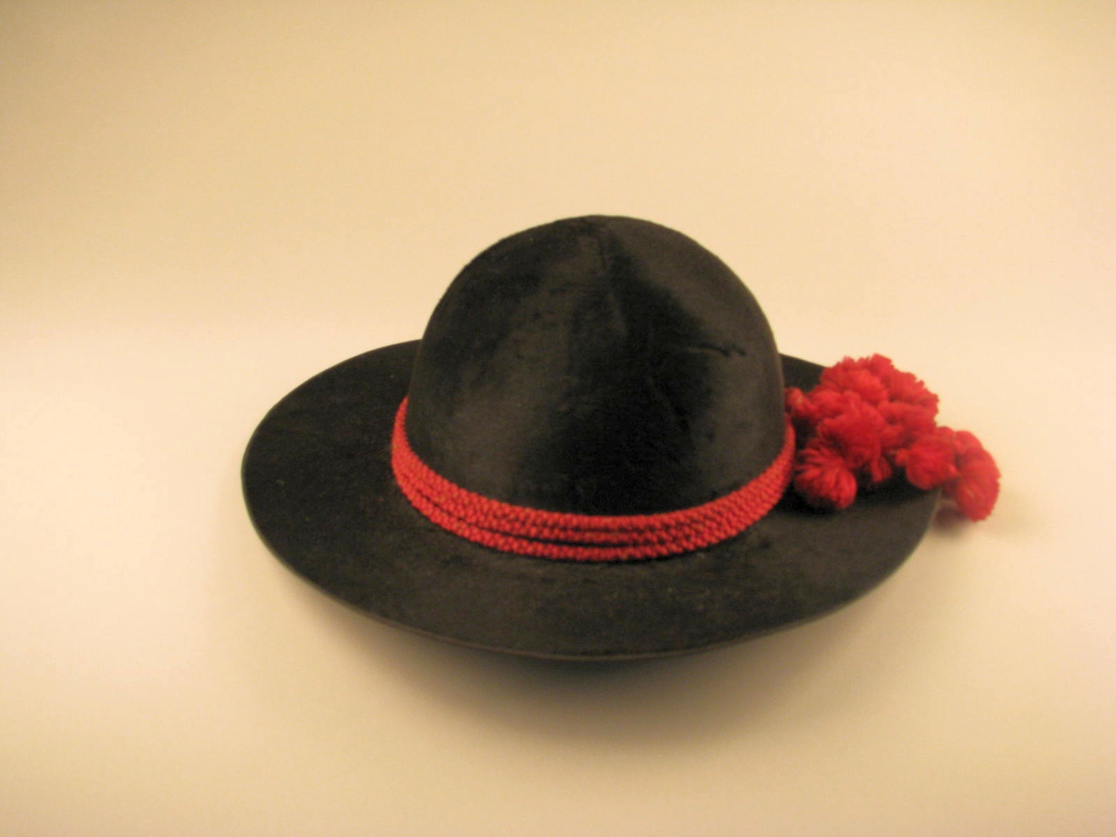 Prelatenhoed van zwart vilt met een drierijige zijden purperen koord met kwasten aan de linkerkant