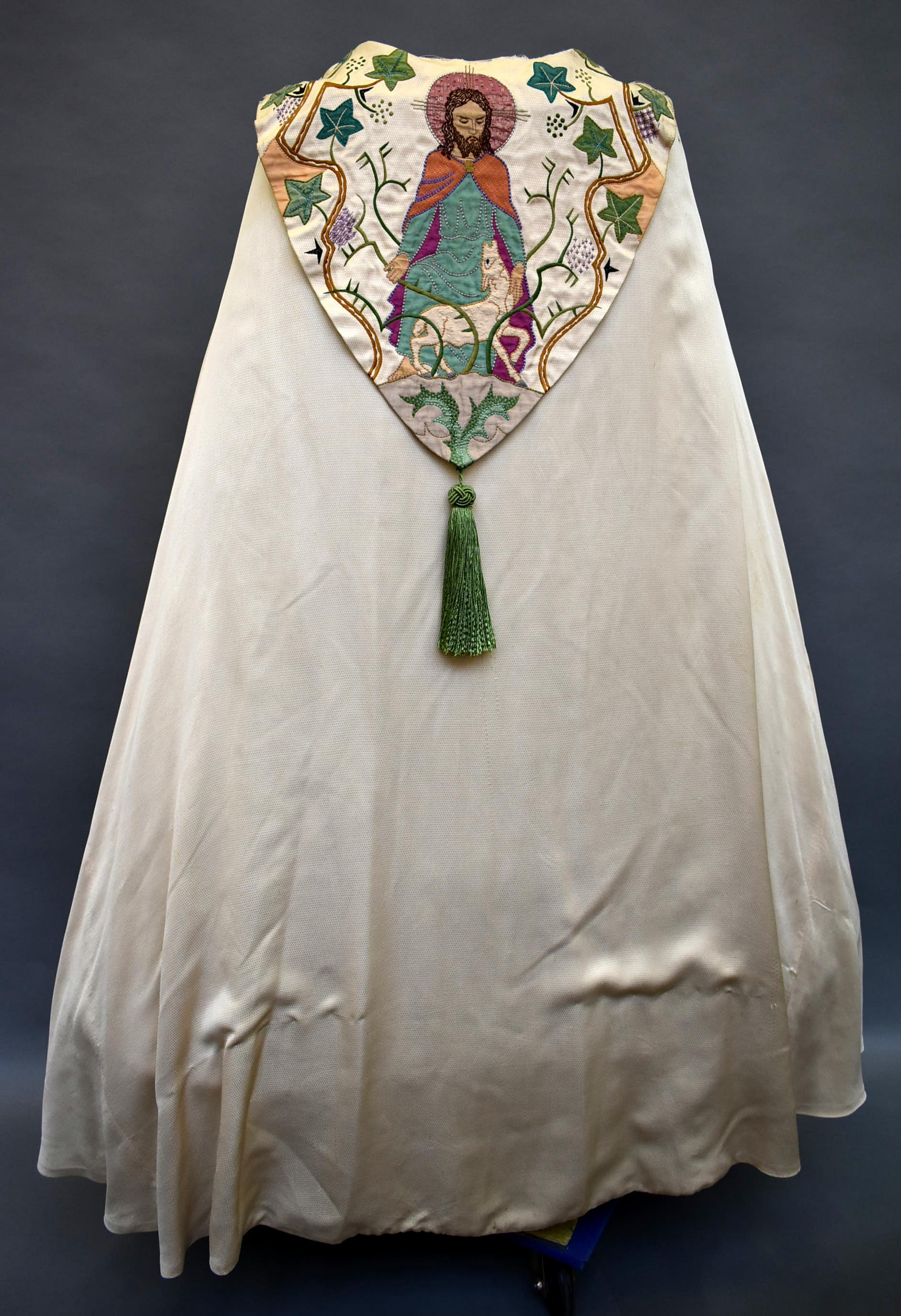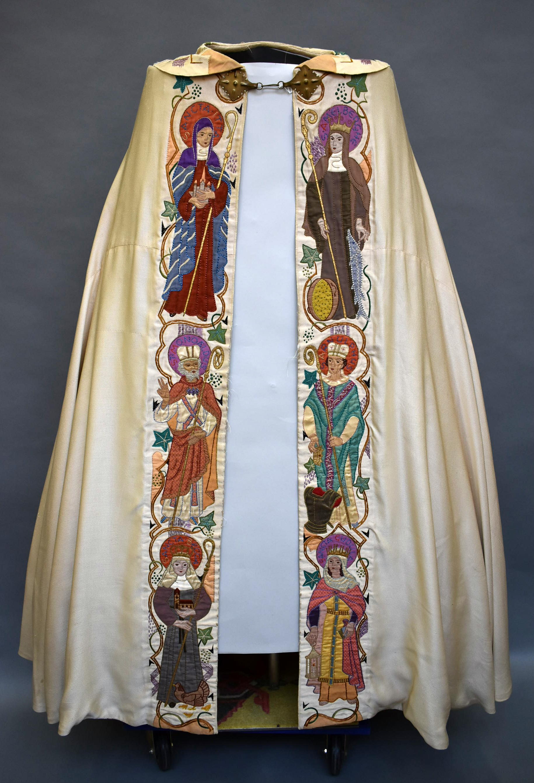 Crèmekleurige koorkap met koorkapschild waarop Christus met lam in doornstruik, op voorzijde zes heiligen, o.a. H. Begga van Andenne