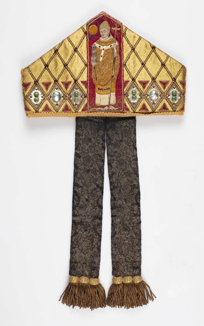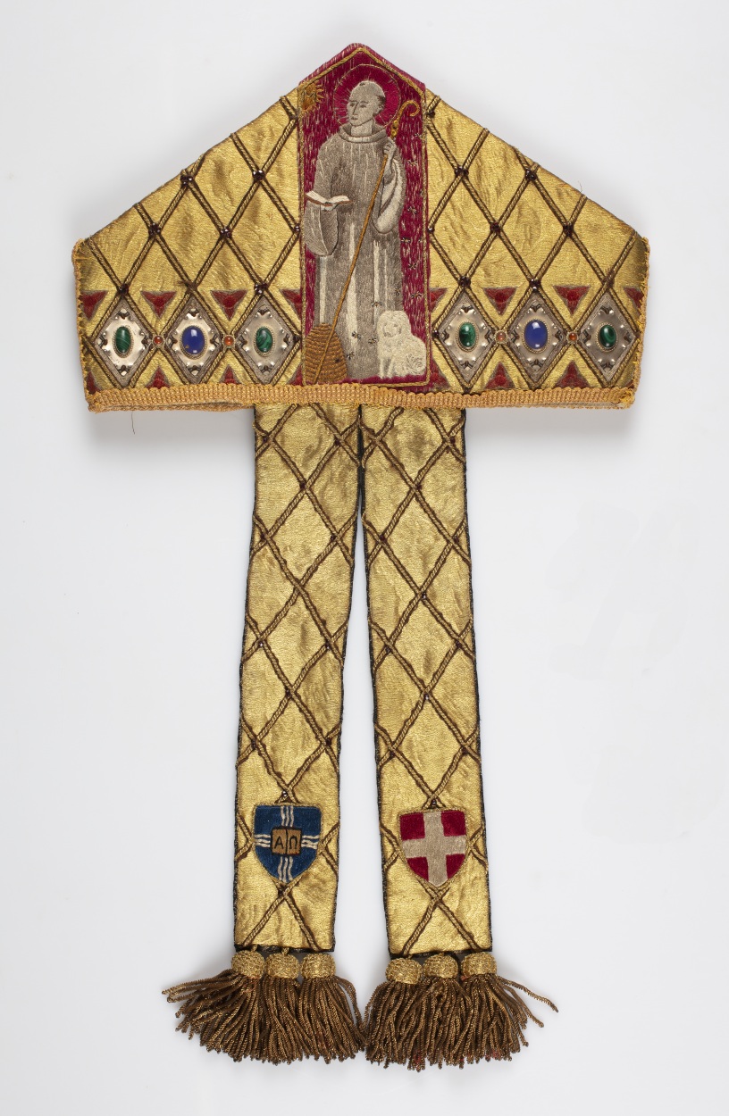 Wijdingsmijter (mitra preciosa) van Bernardus Johannes Alfrink, met Willibrord met staf en Domtoren, op achterzijde Bernardus van Clairvaux met bijenkorf en hond, op de linten links het wapen van Alfrink en rechts van het aartsbisdom Utrecht