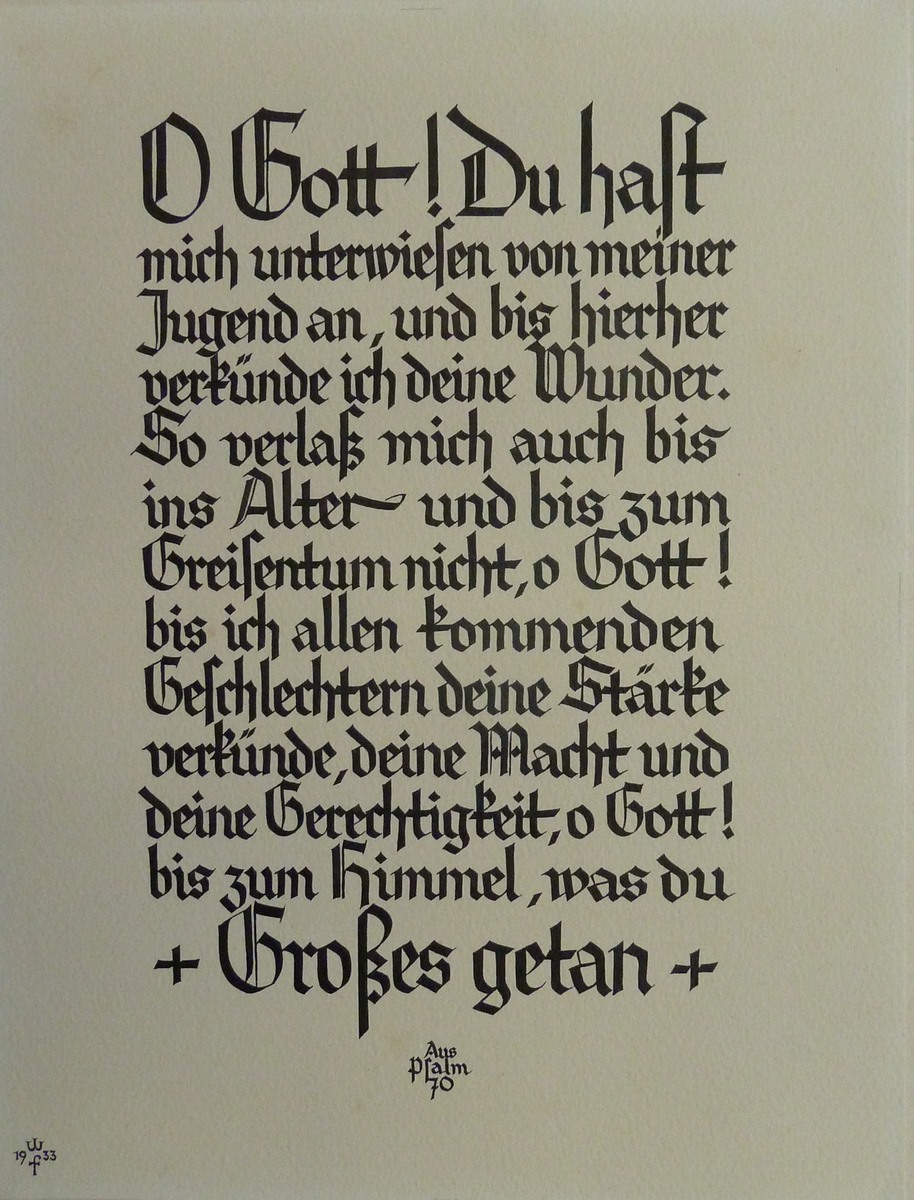 Kalligrafie (schriftproeve) met "O Gott! Du hast mich unterwiesen von meiner Jugend an, ..." (Ps.70)