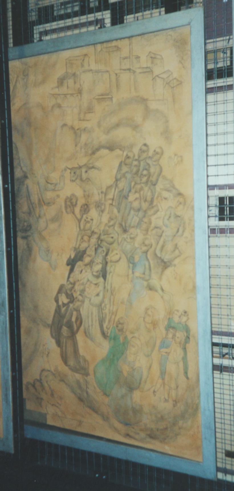 Ontwerp wandschildering, groep vrouwen, kinderen, werklieden, ruiters (St. Jozefkweekschool, Zeist)