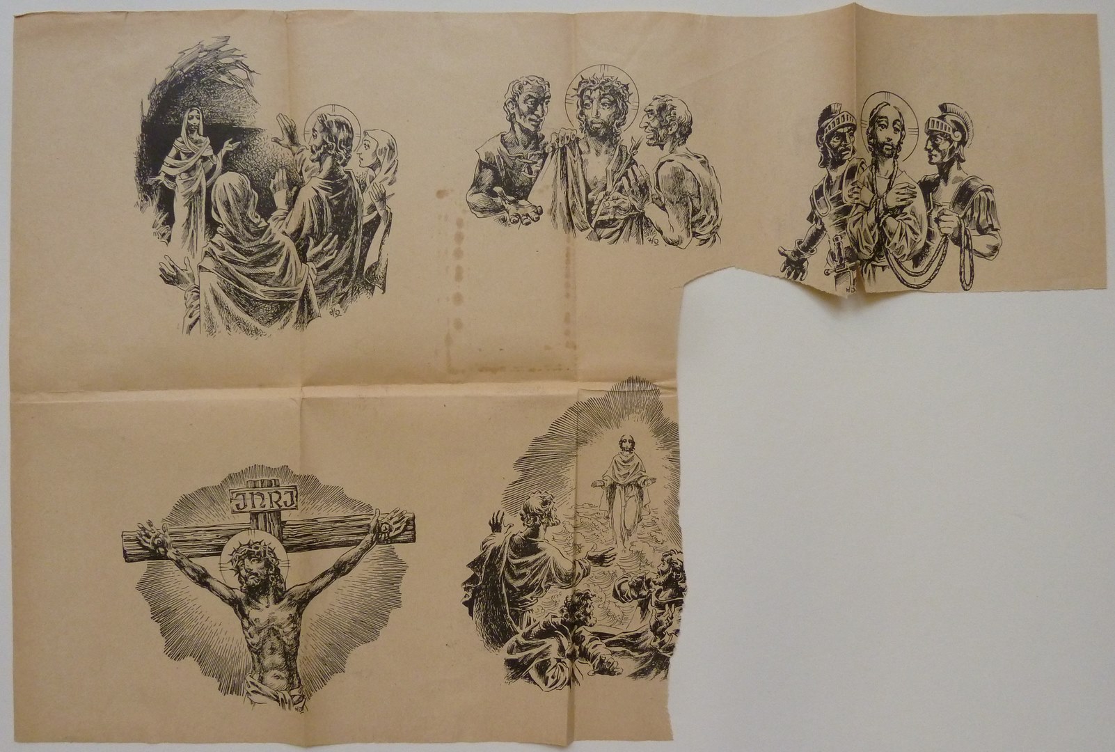 Gescheurde prent met vijf (van oorspronkelijk zes) afbeeldingen uit het leven van Christus