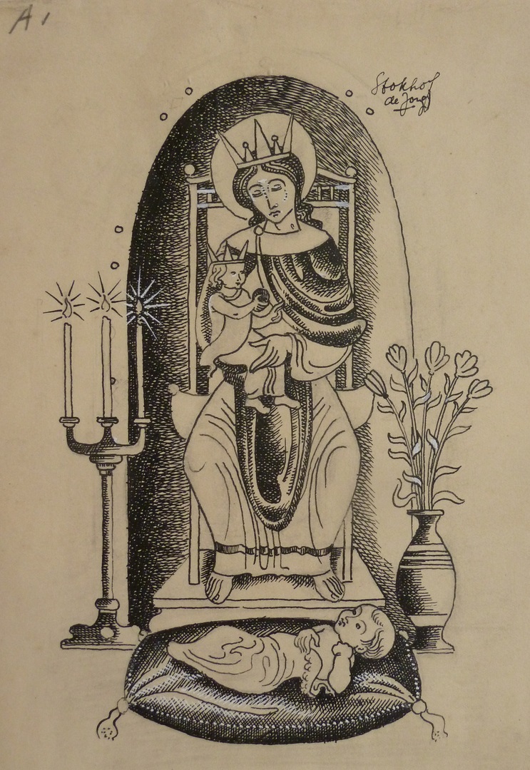 Ontwerp moeder en kind op troon, daarvoor een kind op een kussen