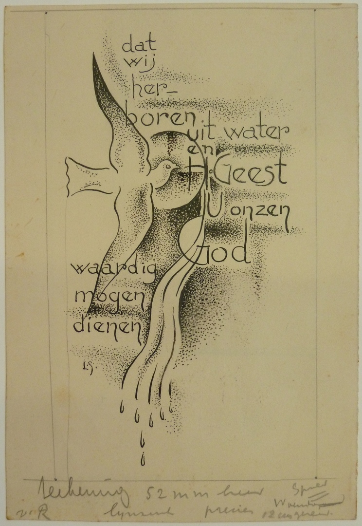 Ontwerp met vliegende duif en de tekst dat wij herboren uit het water en H. Geest enz.