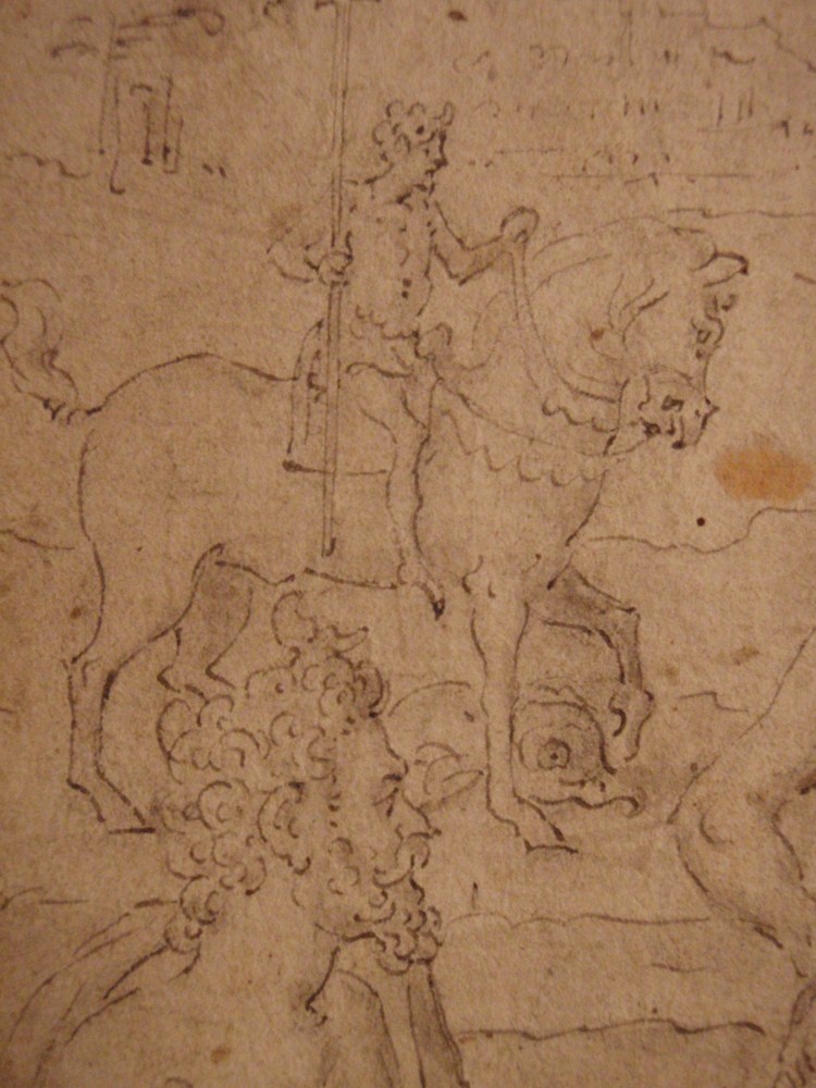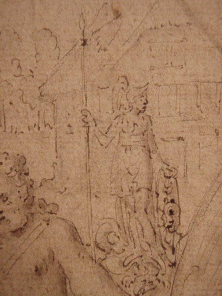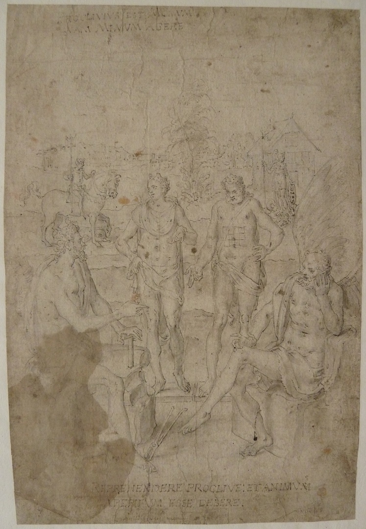 Ontwerp voor embleem nr. 1 van Hadrianus Junius’ Emblemata: eiusdem aenigmatum libellus (1565), met de god Vulcanus, twee beelden van menselijke figuren en de god Momus, op de achtergrond Neptunus op een paard en Pallas Athene voor een huis.