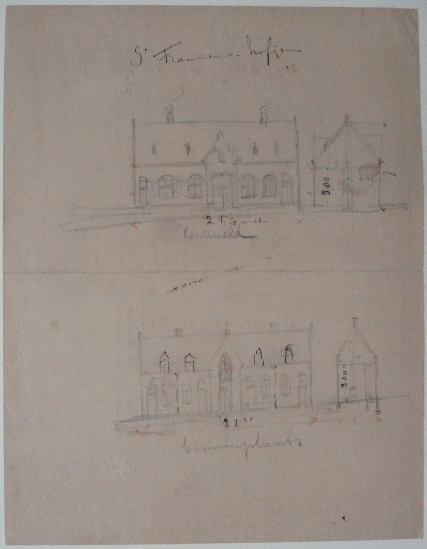 Aanzichten van de St. Franciscus hofjes vanaf Kerkveld en binnenplaats, kz. twee plattegronden