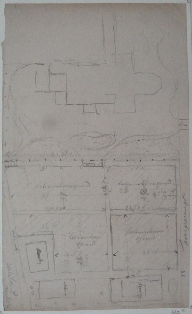 Schets met plattegrond van kerk en aangrenzend gebouw, kz. twee plattegronden en berekeningen