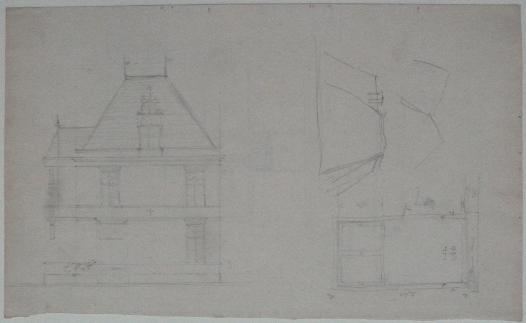 Ontwerpschets voor gebouw, aanzicht en plattegrond, kz. plattegrond