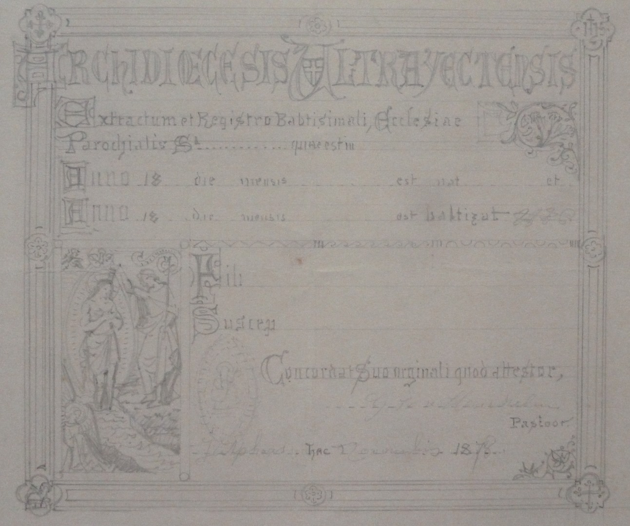 Ontwerpschets voor doopbewijs met linksonder afbeelding van Maria, Christus en engel