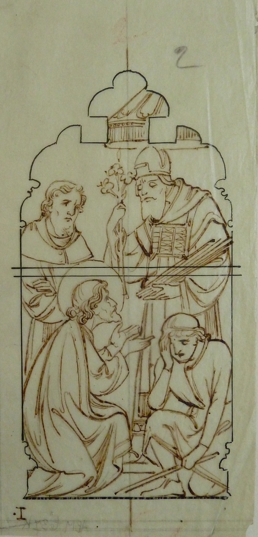 Geknielde heilige voor bisschop met lelie in de hand