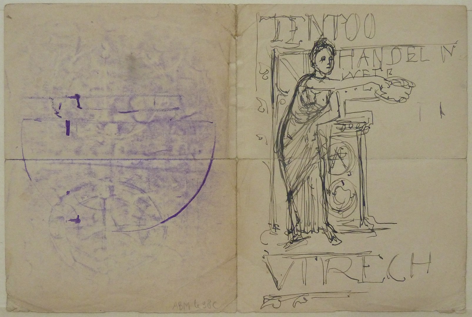 Gevouwen blad met staande vrouw en "Tentoo ... Handel ..."