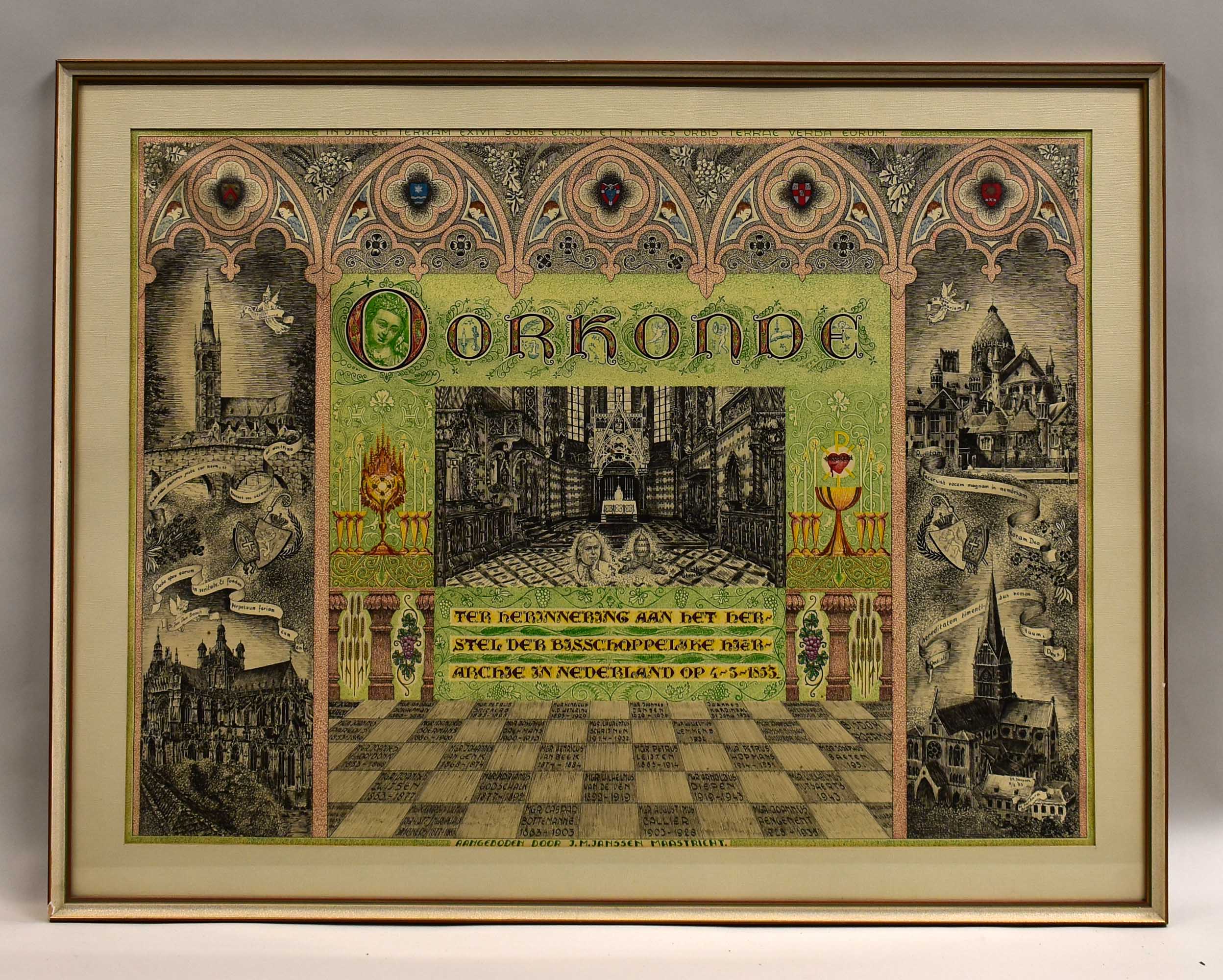 Oorkonde 100-jarig herstel bisschoppelijke hierarchie o.a. met interieur Catharinakerk Utrecht