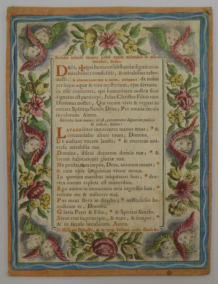 Canonbord met gedrukte tekst, omlijst door bloemguirlande met puttikopjes