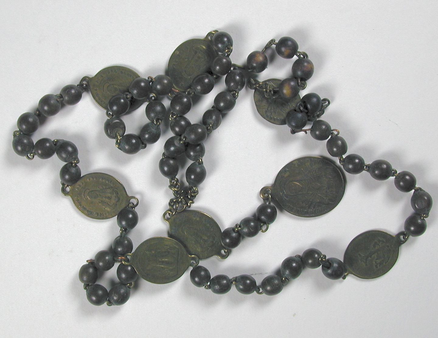 Rozenkrans van zwarte, houten kralen, met koperdraad geschakeld. Staart van drie kralen met een ovale, kopreren medaille als hanger; vz.: Maria met in haar hart zeven zwaarden. Opschrift: Mater dolorosa ora pro nobis. Kz.: Christus aan het kruis in een landschap met aan de voet van het kruis Maria Magdalena. Opschrift: Il est mort pour ...